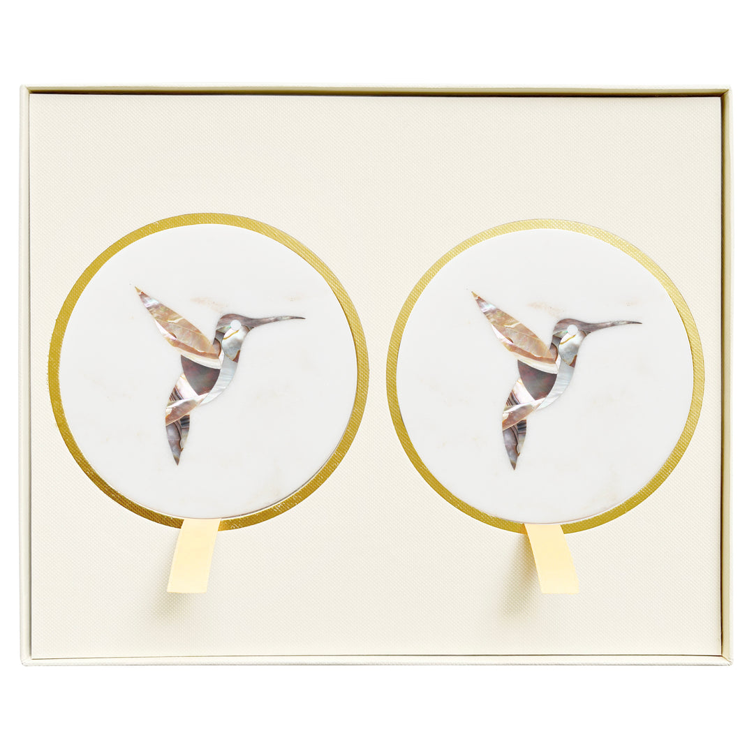 These exquisite coasters are handcrafted in marble by master craftsmen using the technique of "Pietra Dura", marble inlay. A highly skilled and intricate art form that involves the delicate placement of semi-precious stones onto a marble base to create stunning patterns, images, and designs. Featuring a beautiful bird motif on the surface made using semi-precious stones, these coasters are playful yet stylish.