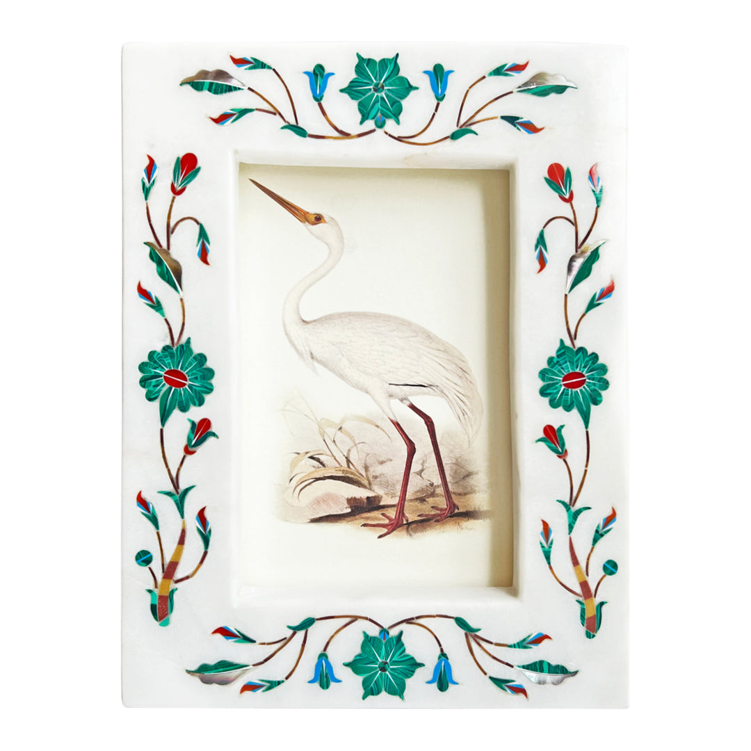 This picture frame is a beautiful representation of the old, elegant art of marble inlay work of Agra, also known as ‘Parchin Kari’. Marble Inlay in Agra has flourished since the 17th century when it was introduced to the region by Persian tradesmen. Crafted by artisans by hand-cutting semi precious stones, then precisely matching floral motifs outlined on the surface of the marble, and inlaying them into it. The effulgent glow of the white marble makes this frame a timeless decorative piece.