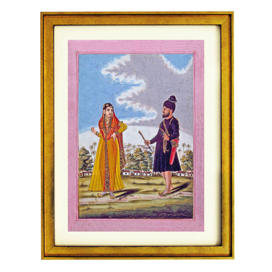 This gouache drawing depicts a Sikh soldier and his wife outside a row of barracks, likely from the 18th or 19th century. The soldier wears a black uniform with a turban and holds arrows, while the wife is dressed in a vibrant yellow outfit with intricate floral details. The background features palm trees and a cloudy sky, adding depth to the composition.