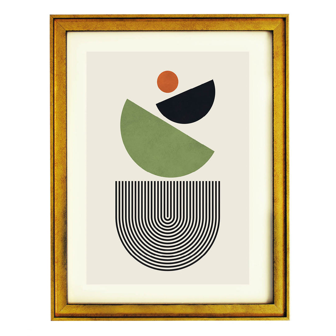 Shapes that float, shift, and stack—this artwork in olive green, rust orange, and black invites calm through dynamic form. A study in modernist balance and layered simplicity.
