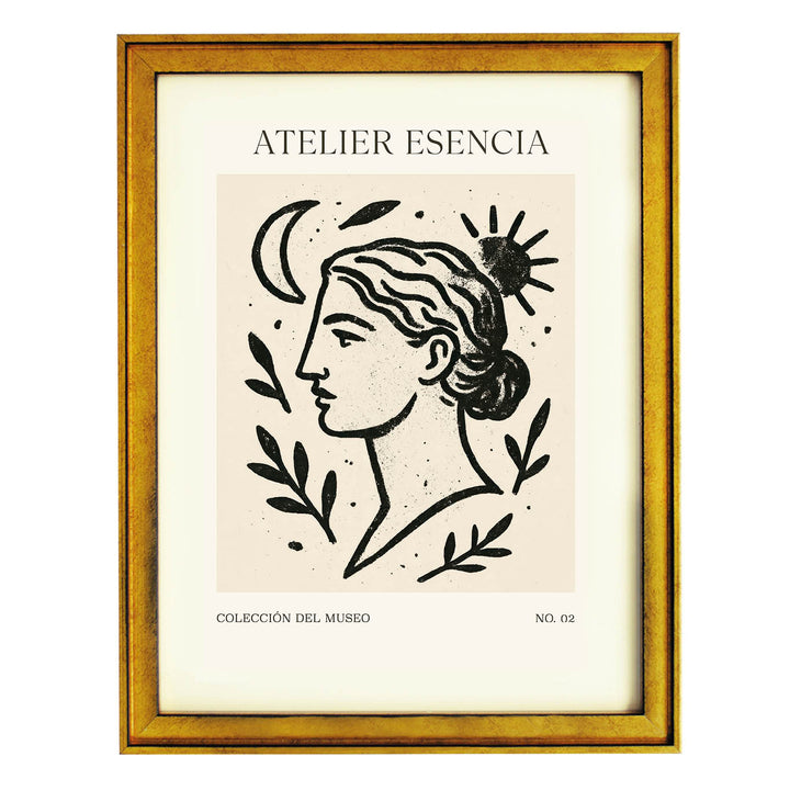 Evoking the spirit of classical frescos, this profile portrait is surrounded by celestial and botanical motifs. A celebration of the feminine divine, captured in an ancient-modern aesthetic.