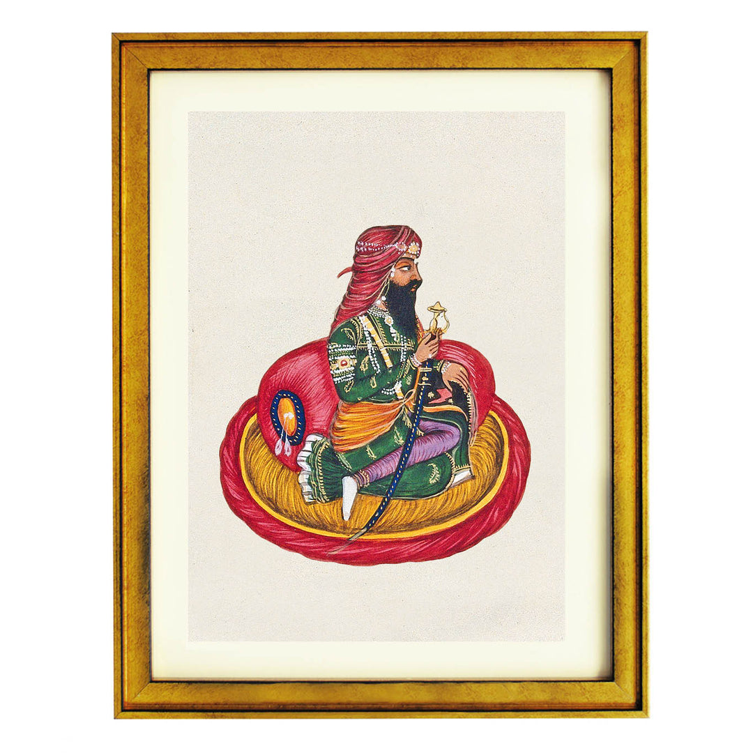 This 19th-century gouache painting portrays a Sikh warrior seated with quiet dignity, embodying both strength and sophistication. Clad in an opulent green and gold ensemble, he holds a ceremonial dagger—a symbol of his martial heritage. His richly adorned turban and intricate jewelry reflect his noble lineage, while the delicate brushwork brings out the details of his attire and expression. A striking representation of the warrior spirit and regal elegance of Sikh nobility.