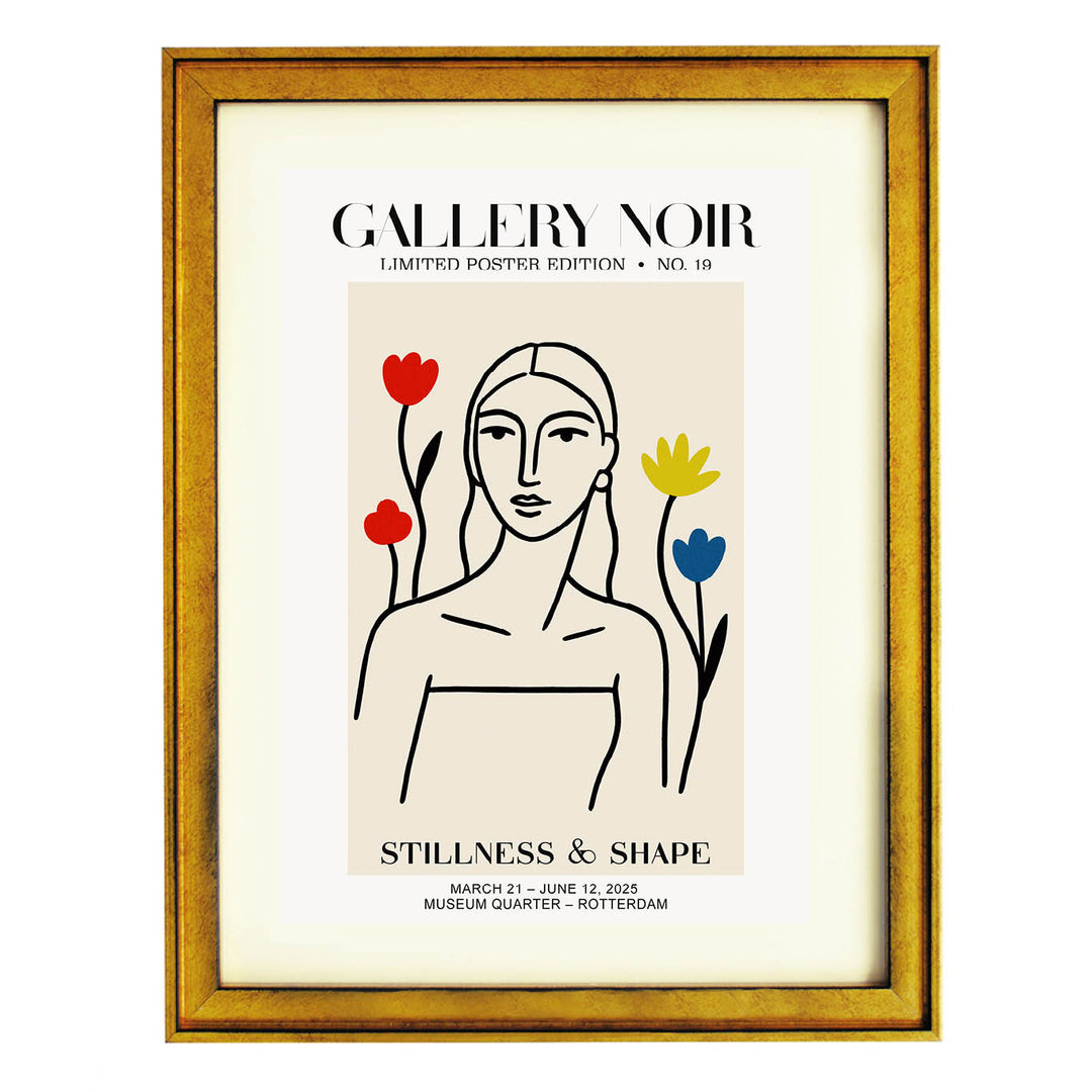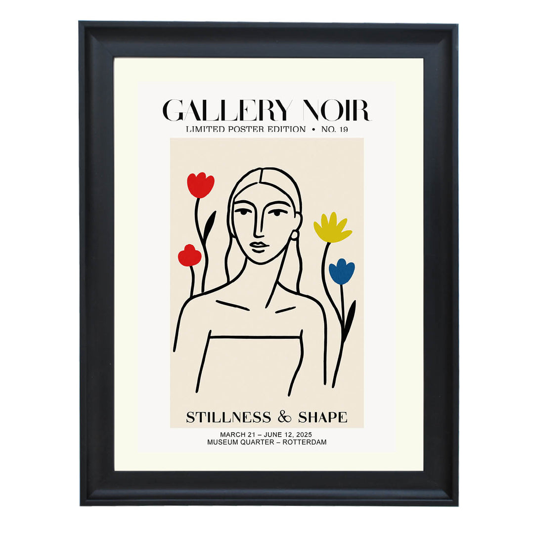 A minimalist female figure emerges among bright tulips—red, yellow, and blue. This print blends femininity with geometric simplicity for a fresh and cheerful aesthetic.