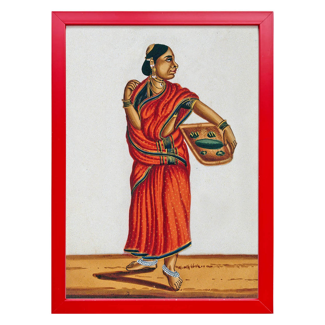 This delicate gouache painting on mica, dating back to the 19th century, captures a Brahmin’s wife in mid-motion, holding a woven basket filled with offerings. Draped in a striking red sari with intricate gold and blue borders, she exudes grace and tradition. Her elaborate jewelry—gold earrings, bangles, and anklets—adds to her dignified presence. The detailing of her facial features, especially her sharp profile and expressive gaze, gives life to her poised stance. This artwork is a fine representation of Indian miniature portraiture, showcasing the elegance and cultural identity of Brahmin women of the era.