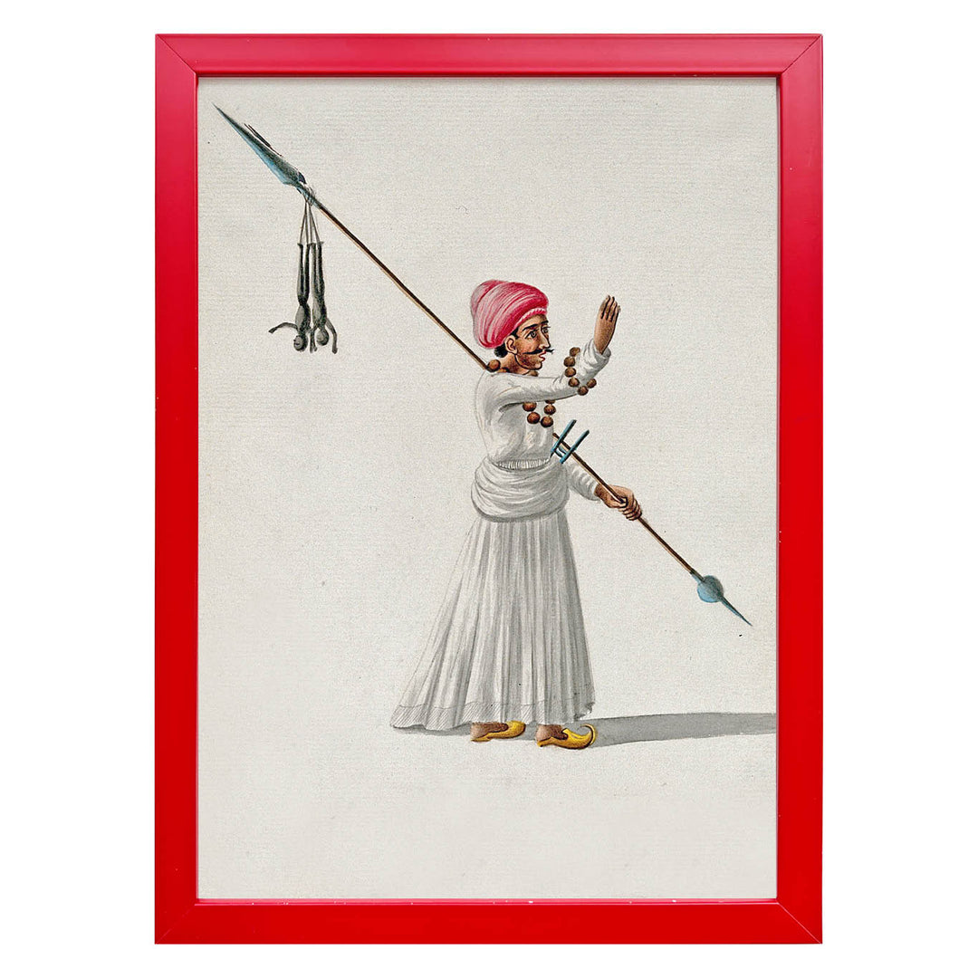 A striking reproduction of a historical artwork, The Sentinel captures the commanding presence of a traditional Indian warrior or sentinel, depicted in intricate detail. Dressed in flowing white robes with a crimson turban, he stands poised, spear in hand, adorned with rudraksha beads and a dagger at his waist—symbols of both devotion and duty. The delicate shading and fine brushwork bring out the regal stance and rich cultural heritage of this piece. Encased in a bold red frame, this print makes a striking statement, blending history with contemporary decor. Perfect for those who appreciate heritage art with a bold edge.