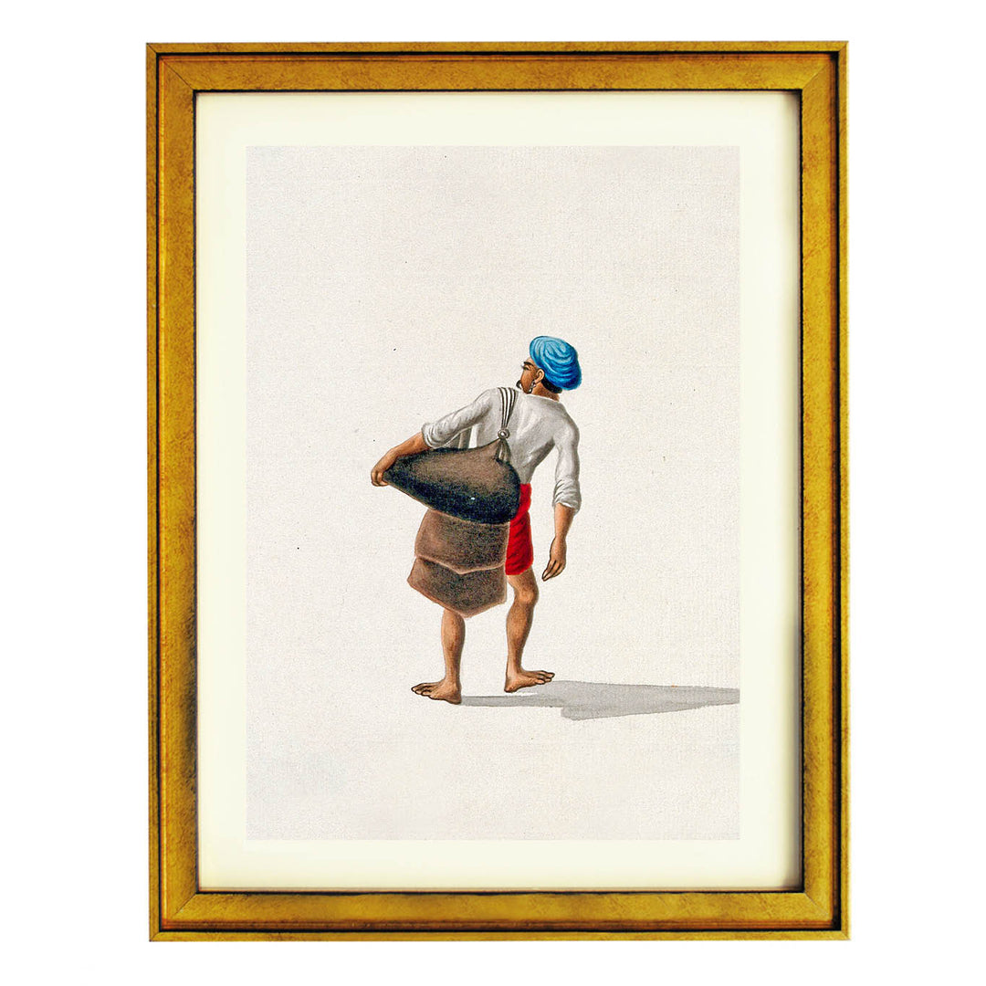 This finely detailed gouache painting by an Indian artist depicts a traditional water carrier, a vital figure in everyday life. Dressed in a simple white shirt, red cloth tied around his waist, and a striking blue turban, he carries large leather water bags slung over his shoulder. His bare feet and slightly turned posture suggest movement, as if he is glancing back while on his daily route. The restrained color palette and meticulous shading bring depth to the composition, highlighting both the labor and dignity of his role. A poignant representation of India's working class and the artistry of its painters.