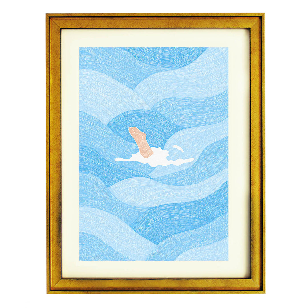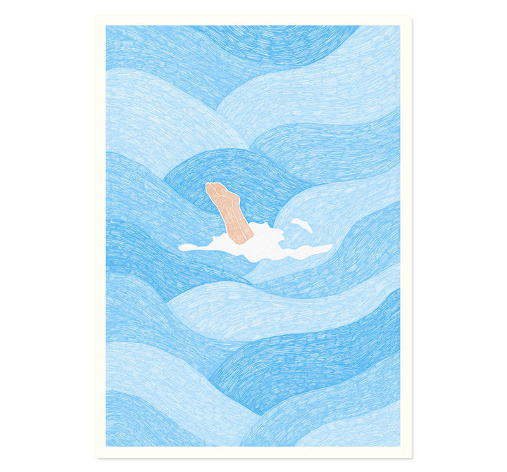 Dive into a dreamscape of swirling blue waves with this whimsical print, where a lone foot playfully breaks the surface. An ode to carefree summer dips and childhood nostalgia, it's perfect for bathrooms or any space that needs a splash of fun.