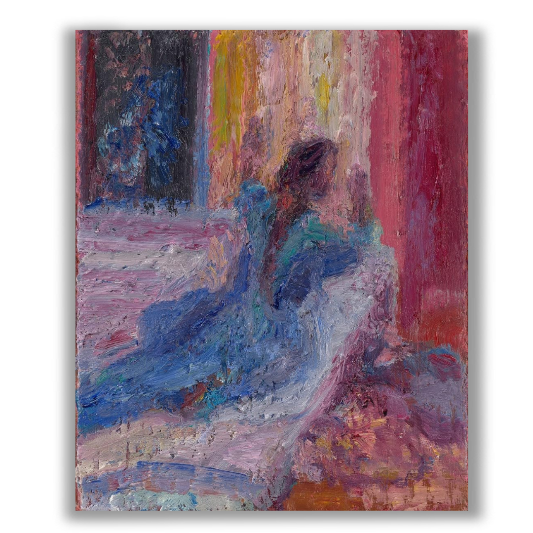Chuhan often depicts lone figures in indistinct, nebulous interiors, exploring love and alienation. In other works, couples are huddled together, potentially locked in an embrace. The paintings evoke the psychological tensions between genders, agency and subjection, the familiar and the unreal. Their small scale creates a sense of voyeurism, reminiscent of what is felt when one looks through a window. Glimpses of bodies are shown in expressive poses that speak to moments of privacy, intimacy and vulnerability.
