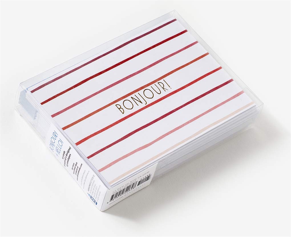 Simple and elegant, these jaunty cards lend a certain je ne sais quoi to your correspondence. Each box contains 12 foil-stamped cards (6 each of 2 designs) and 13 coordinated envelopes. One of the card designs says “Bonjour!” and the other card design says “Hello!”