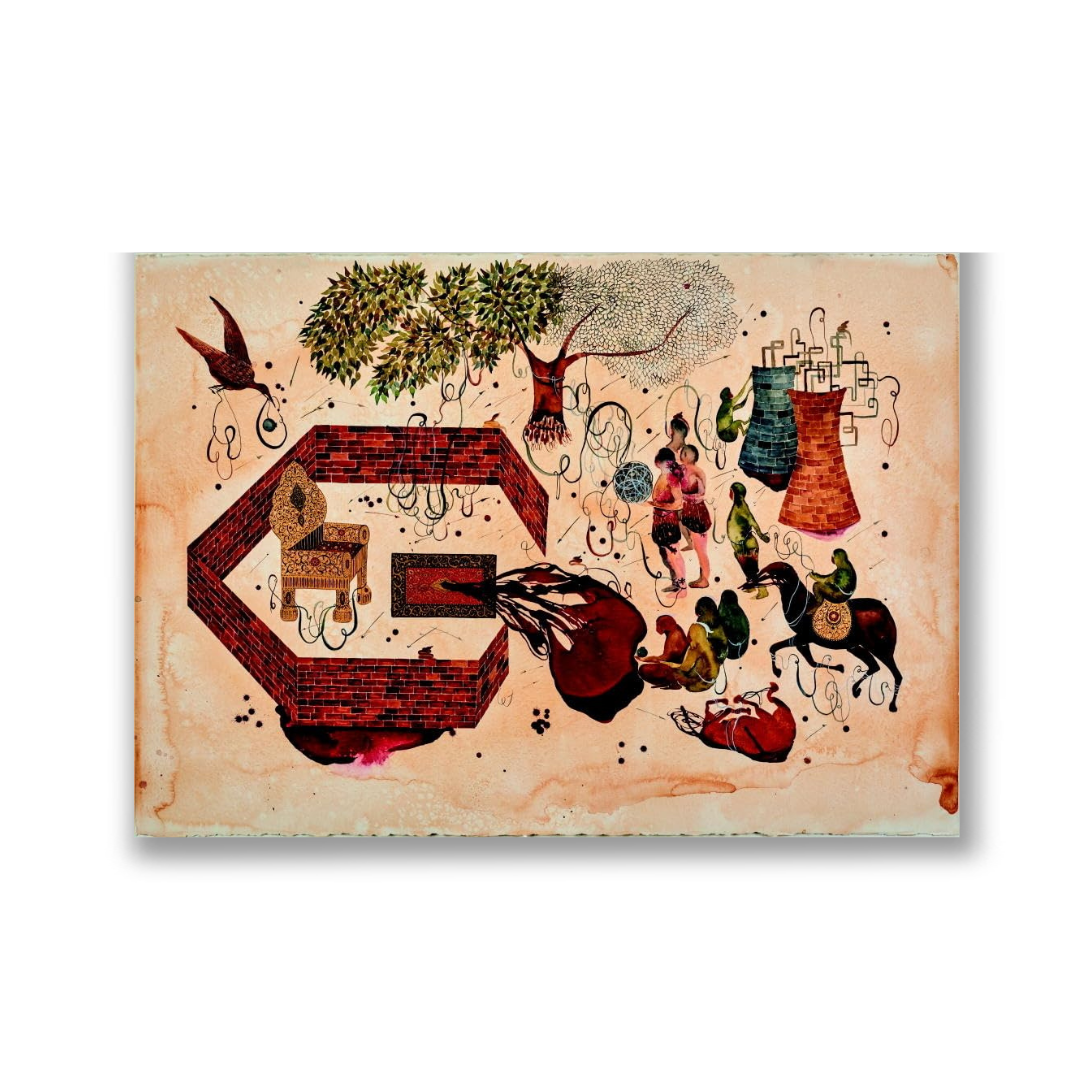 Growing up in the Islamic Republic of Iran, the artist Shiva Ahmadi recalls, she knew more about Jackson Pollock than Behzad, the master miniature painter of the Safavid court. Indeed, Ahmadi’s distinct painterly style seems to combine the detailed precision of Behzad’s hand with the fluid action painting of Pollock. What emerges is part miniature, part abstract expressionism—a decidedly 21st century art form that is both bold and contemporary.