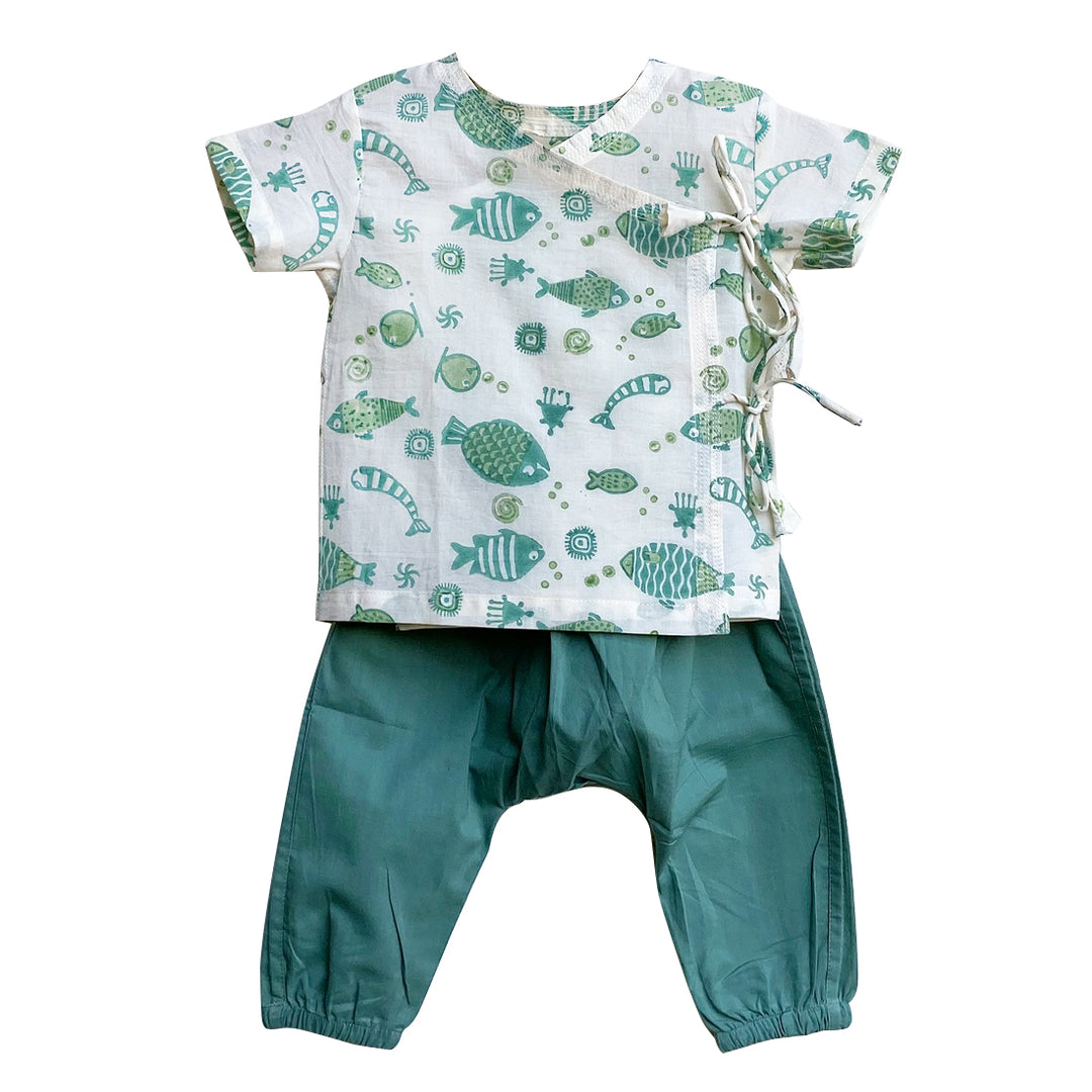 UNISEX FISH PRINT ANGARAKHA TOP WITH MINT GREEN PYJAMA PANTS