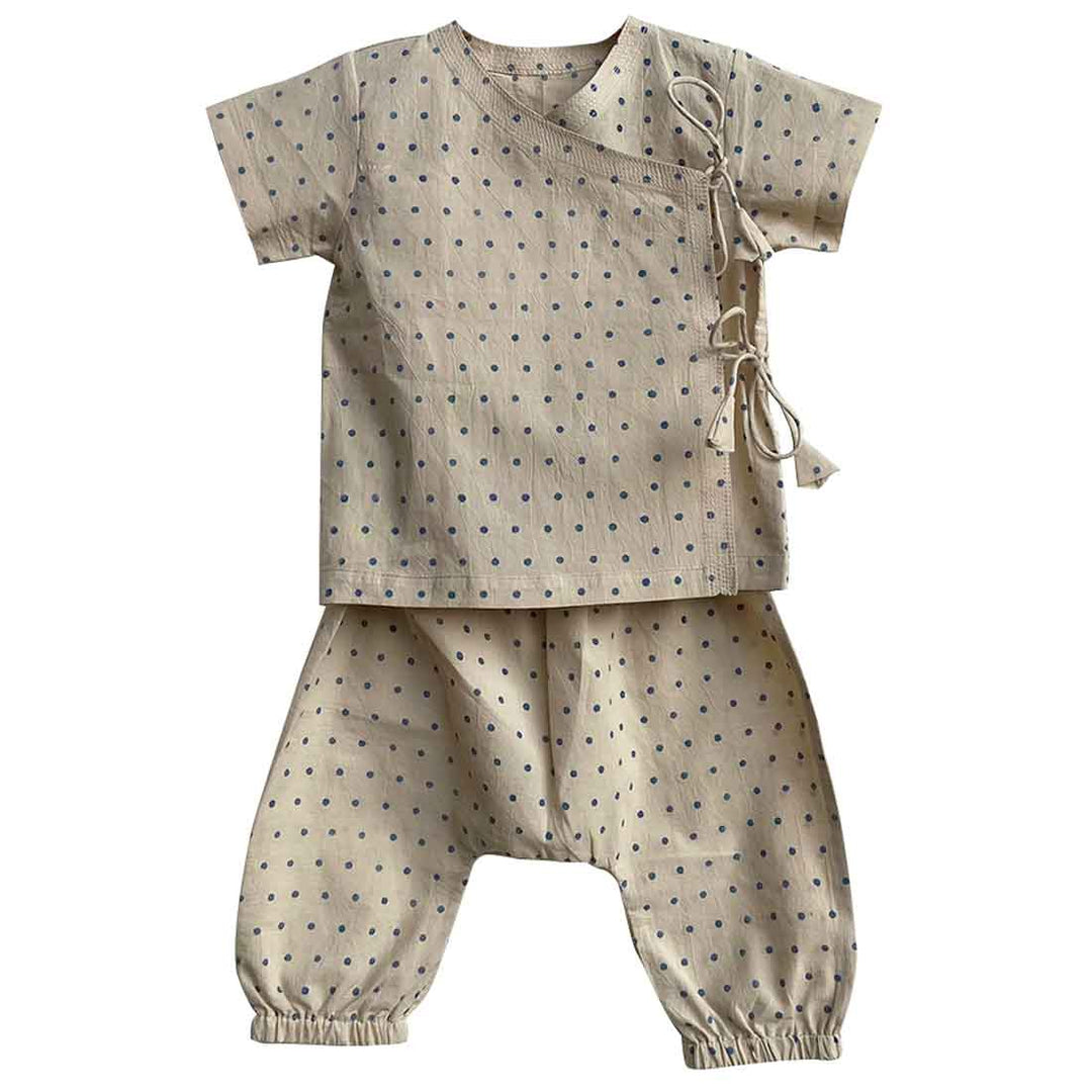 - 1 x angarakha top: 100% organic cotton. Hand-block printed by traditional Ajrakh artisans in naturally hypoallergenic indigo and haldi colours. Tie-up closures and flat seams for ease of wearing and fit. Stitching detail on the neckline adds stability and aesthetic value.