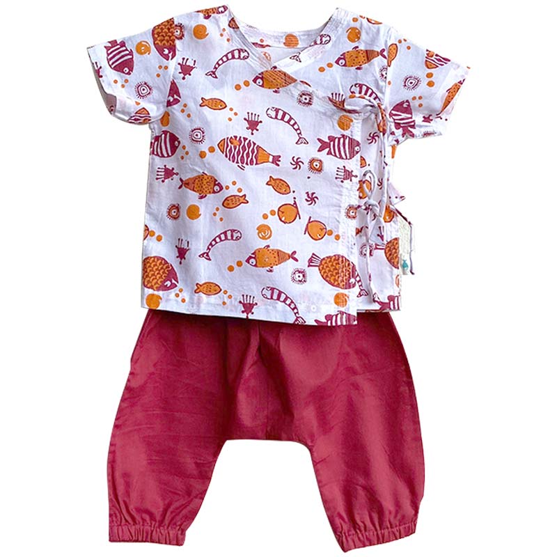 - 1 x angarakha top: 100% organic cotton with all-over handblock printed fishes in shades of orange and red. Tie-up closures and flat seams for ease of wearing and fit. Stitching detail on the neckline adds stability and aesthetic value.