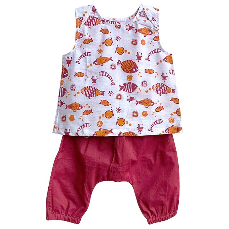 - 1 x jhabla top: 100% organic cotton sleeveless top with envelope neck for hassle-free wearing. All-over handblock printed fishes in shades of orange and red.