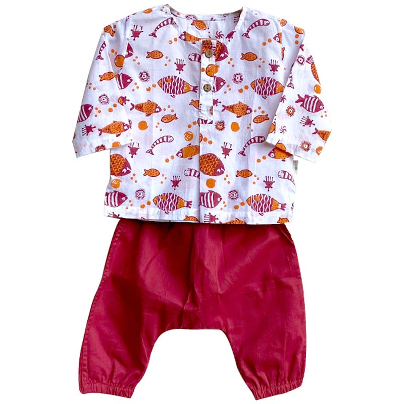 - 1 x kurta top: 100% organic cotton with all-over handblock printed fishes in shades of orange and red. Wooden button closures and flat seams for ease of wearing and fit.