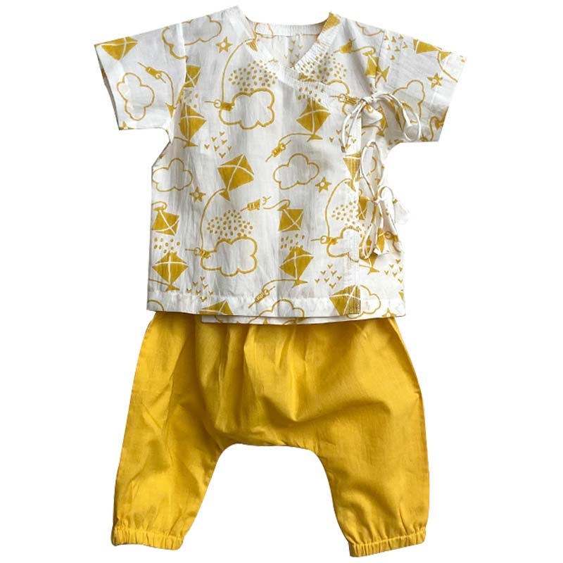 - 1 x angarakha top: 100% organic cotton with all-over handblock printed patang or kite design in the colour of sunshine. Tie-up closures and flat seams for ease of wearing and fit. Stitching detail on the neckline adds stability and aesthetic value.