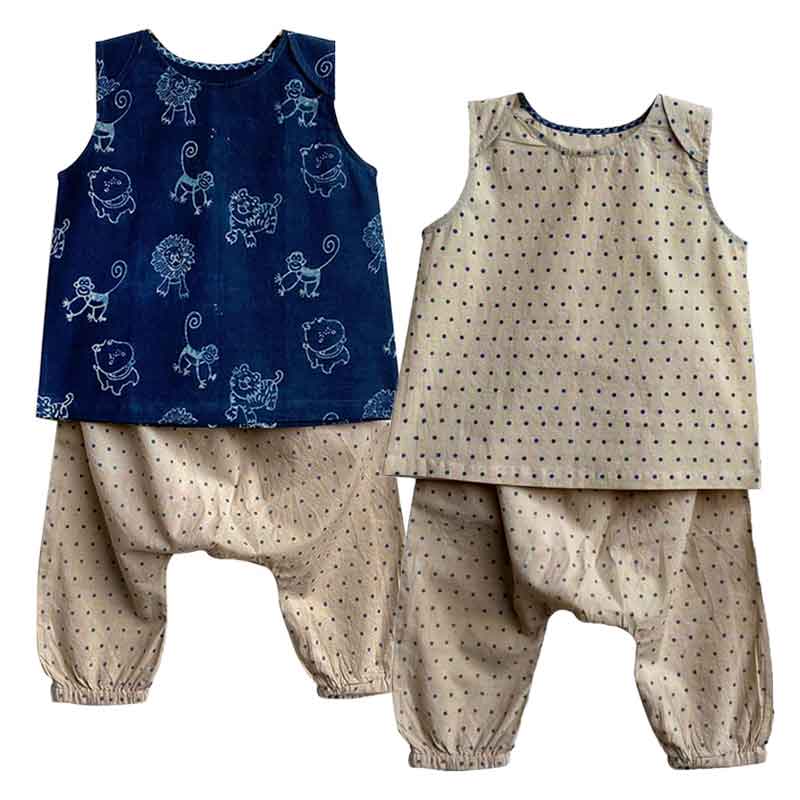 - 2 x jhabla tops: 100% organic cotton sleeveless top with envelope neck for hassle-free wearing. Hand block printed animals in a sea of blue and a printed polka design created by traditional Ajrakh artisans in naturally hypoallergenic indigo colour. Part of our Zoo Treat poem collection.