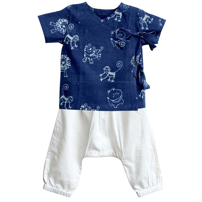UNISEX ORGANIC ZOO PRINT INDIGO ANGARAKHA TOP + WHITE PANTS