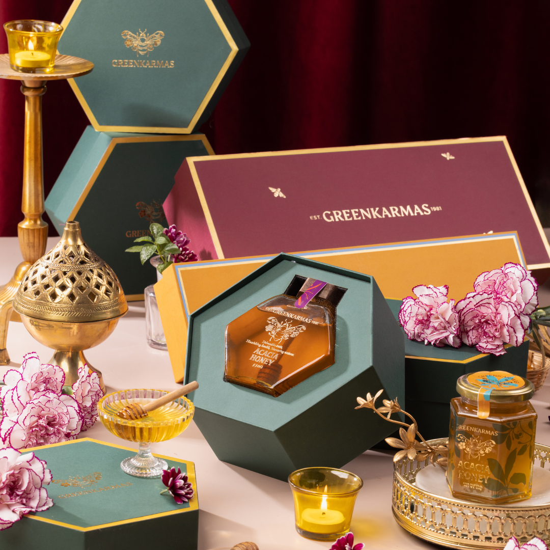 Indulege in the richness with Greenkarmas Best seller Honey Box. A limited edition collection featuring the finest Honey from Kashmir .Thoughtfully curated , this exquisite gift blends luxury ,sustainability, and authenticity. Making it a perfect choice for those who value purity and craftsmanship.