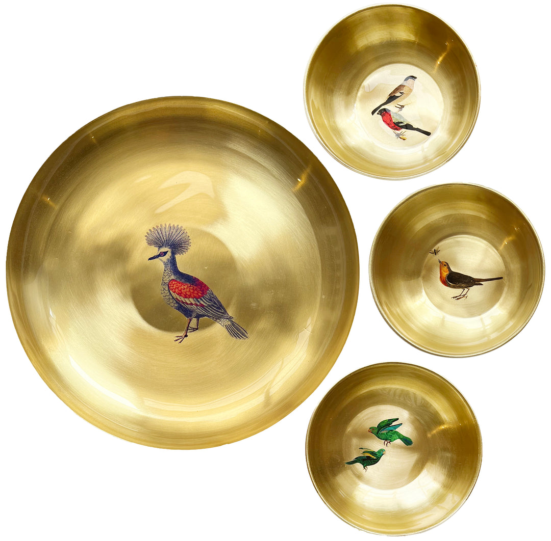 The three brass bowls are meticulously handcrafted, showcasing charming avian prints, portraying the delicate silhouettes of birds sitting perched or mid-flight, evoking a sense of grace and freedom.