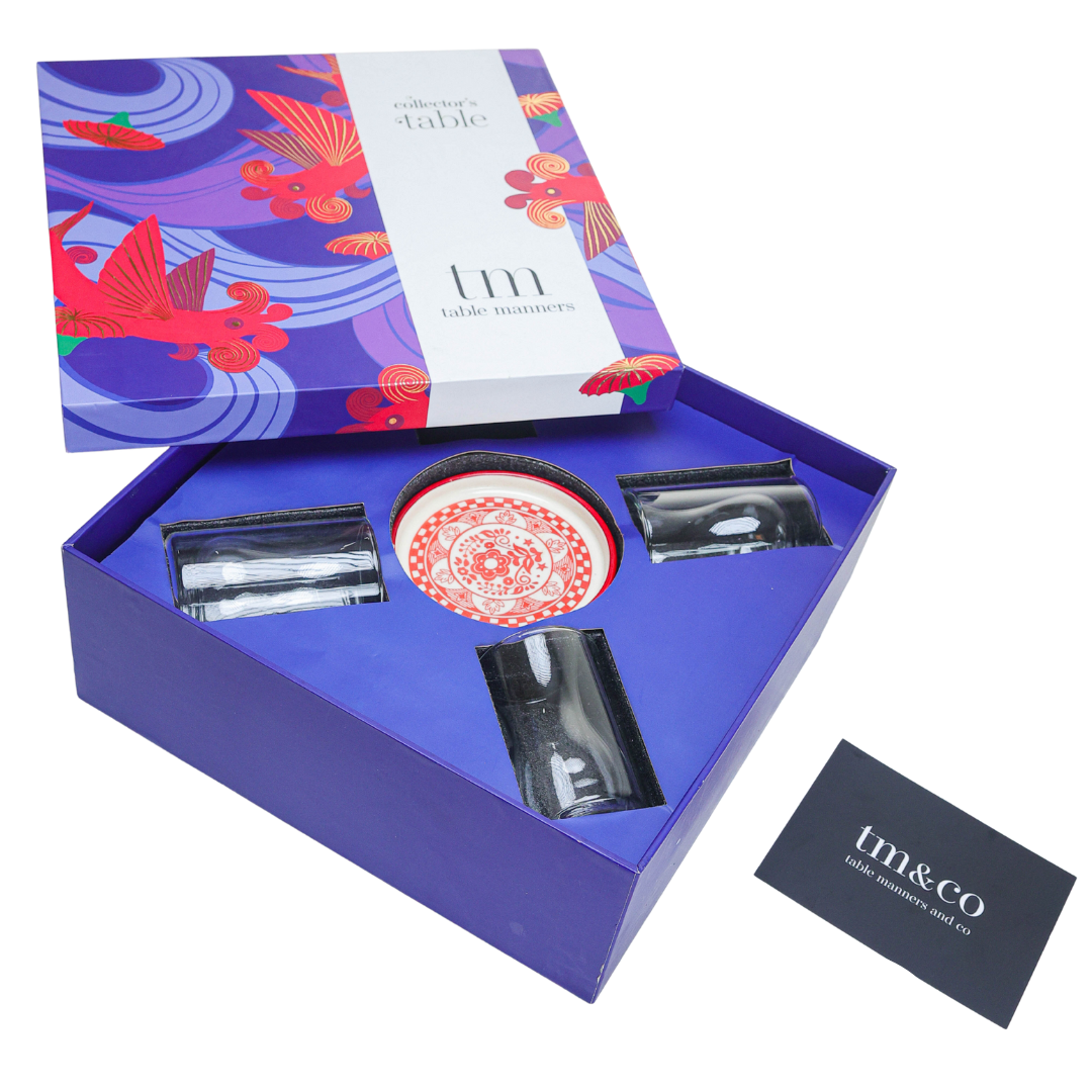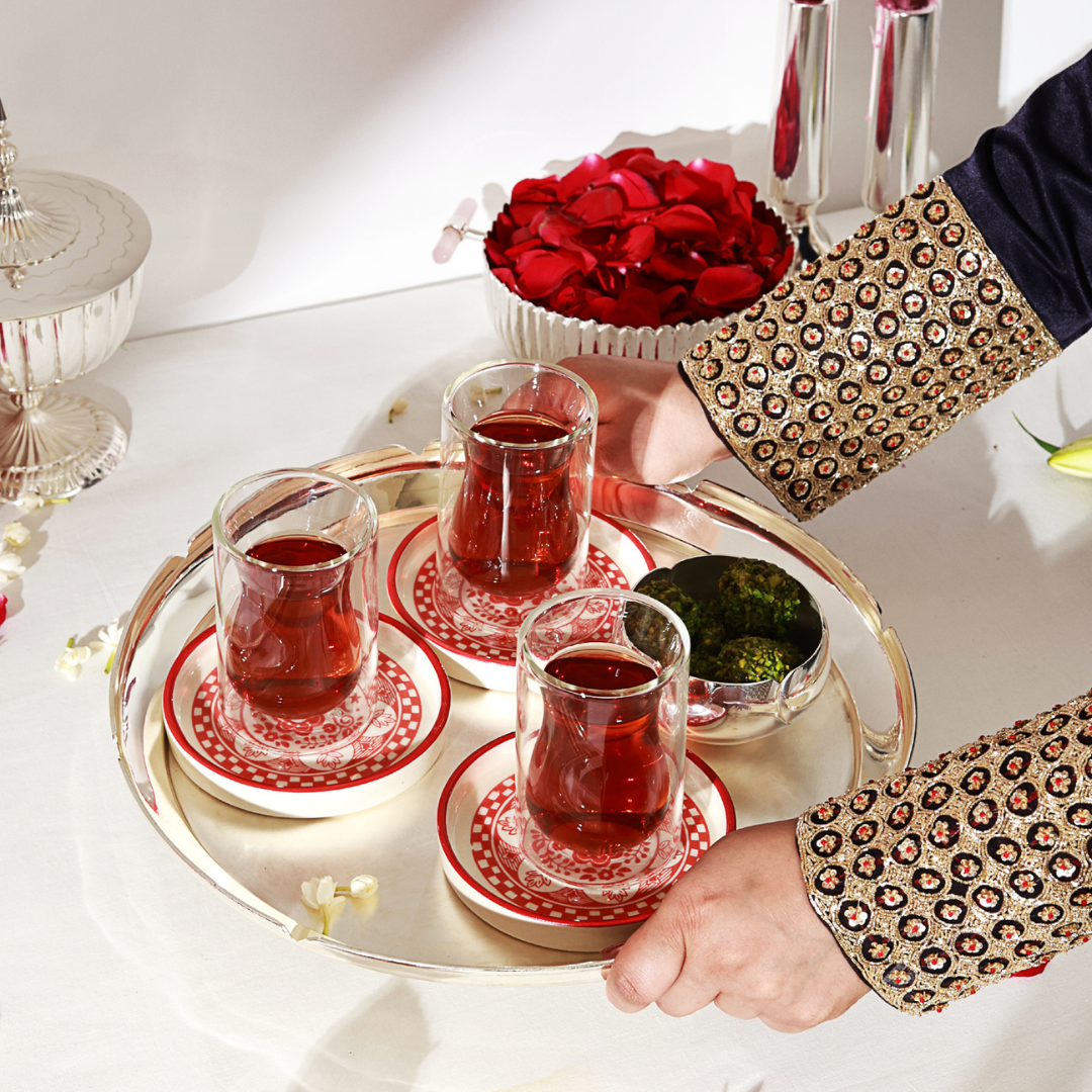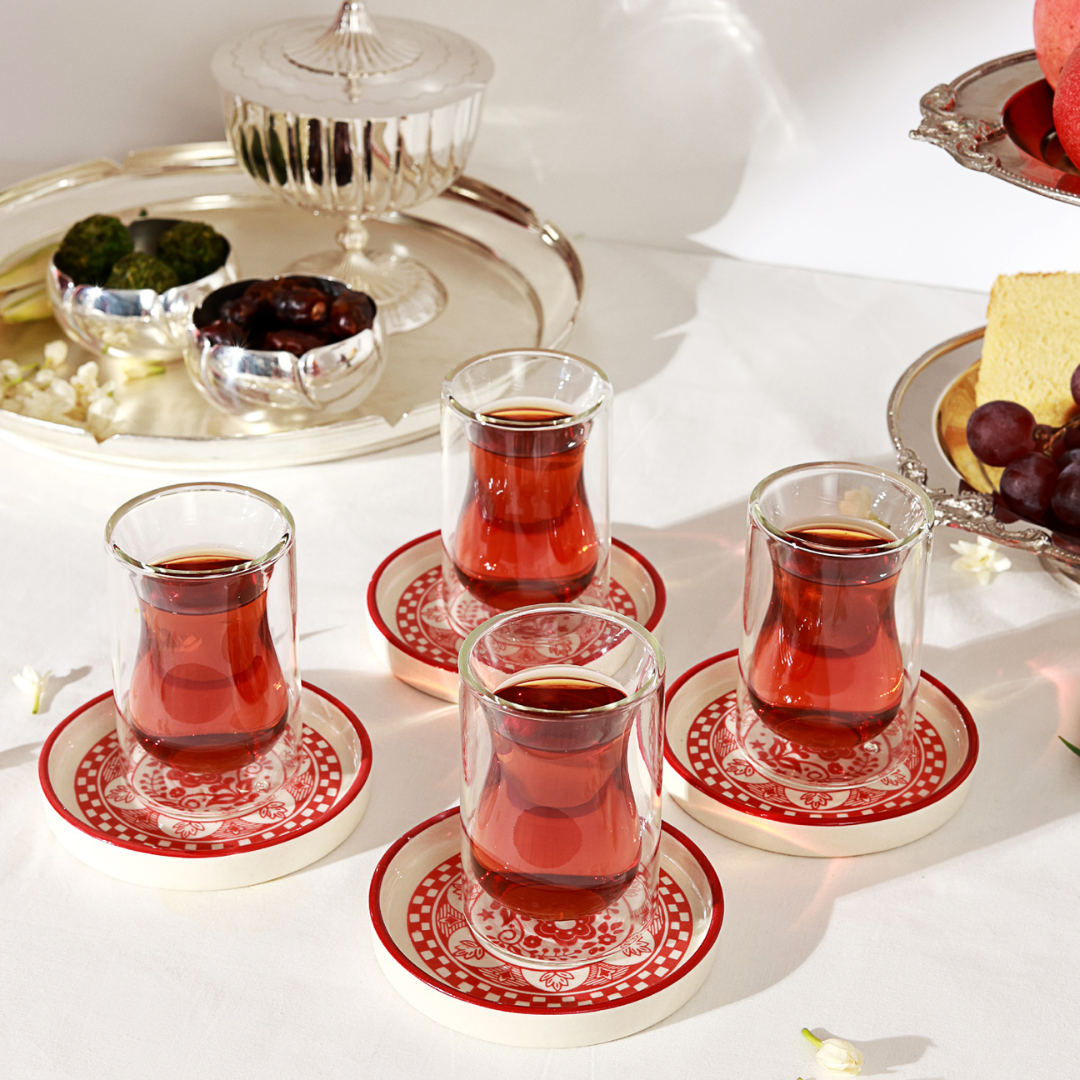 Elevate tea time with this set of 4 Noor-e-Kahwa Sets, each featuring lightweight double-walled glass cups paired with bohemian-style stoneware plates. Thoughtfully packed in a gift box, the blend of transparent glass and textured ceramic offers a stylish mix-and-match look—an ideal gift for tea lovers, art enthusiasts, or anyone who appreciates elegant, handcrafted design.