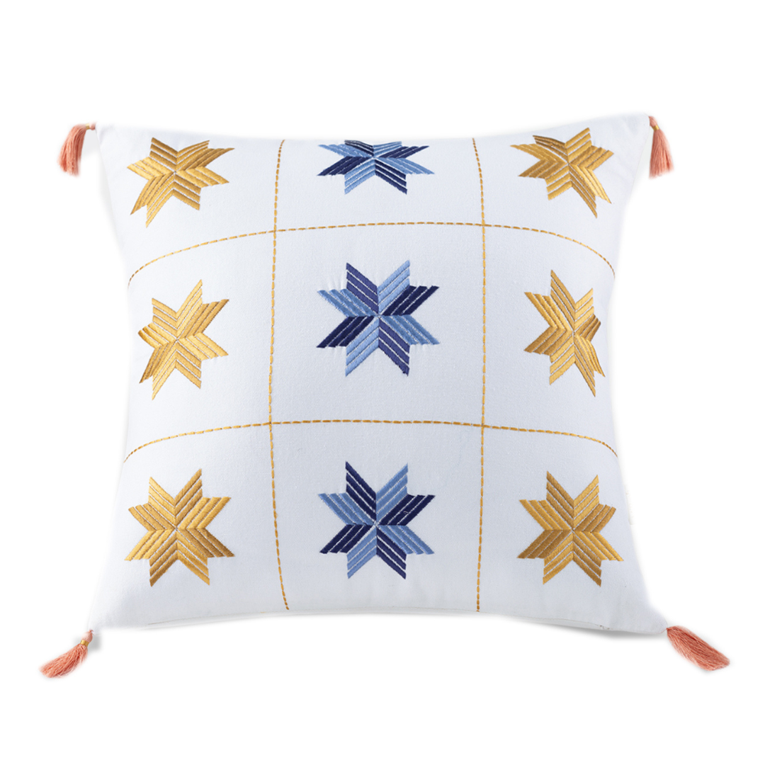 Taking motifs forward, this phulkari is made with a traditional motif of triple V shaped lines which are placed in a way to form beautiful stars. Stars are a symbol of victory and prosperity in ancient Punjab and are used often in apparel as well as other design outlets. Here we use the bold colours of Punjab to match the interior aesthetics of ones home. Settled in the middle is a indigo burst star motif. A pure white base hosts these bold colours giving them the attention they deserve due to their intricate detailing.
