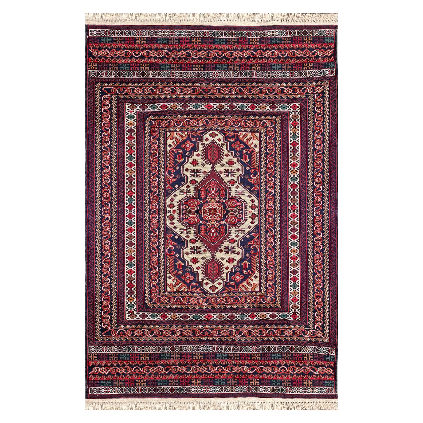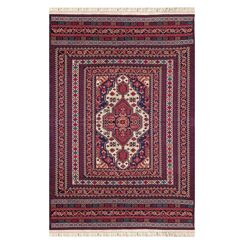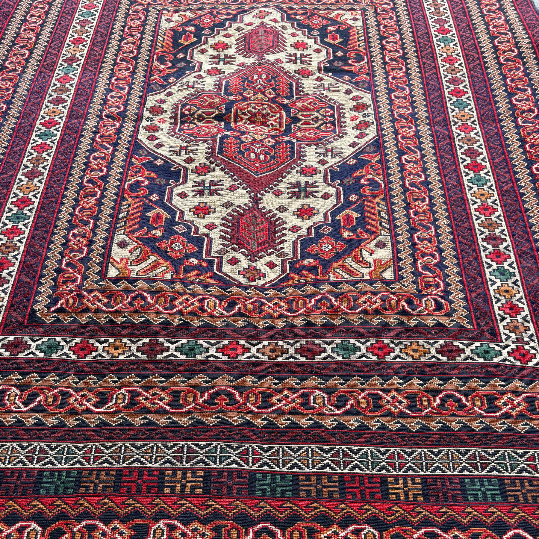 The concentric composition — frame within frame within frame, each one narrowing toward a central point — is one of the oldest organisational principles in Islamic design. It appears in the tile-work of the great mosques, in the carved plasterwork of Mughal architecture, and, with equal authority, in the kilims of Herat. This large piece organises its deep wine-crimson field around a large ivory medallion of concentric geometric construction: successive stepped frames in navy, crimson, and ivory narrowing to a central device, the logic of the inward movement extended to the outer border, which mirrors it in reverse. The palette — wine, navy, ivory — is restrained relative to the most vivid of the Herat kilim group, and that restraint gives the composition a gravity and focused authority that is entirely its own. Woven entirely in wool by Turkmen craftspeople in Herat.
