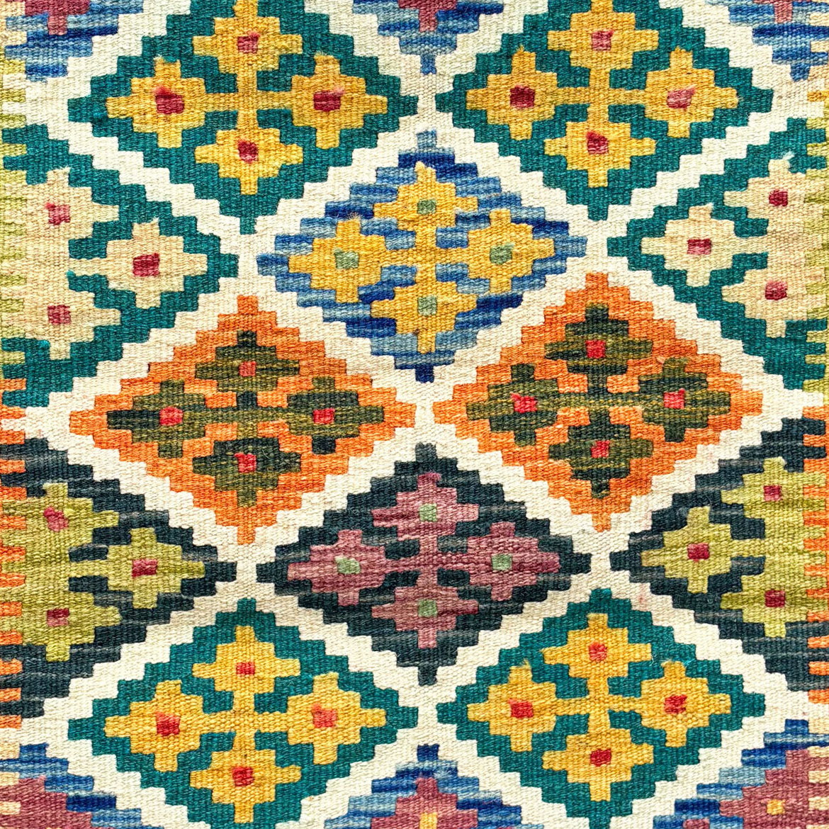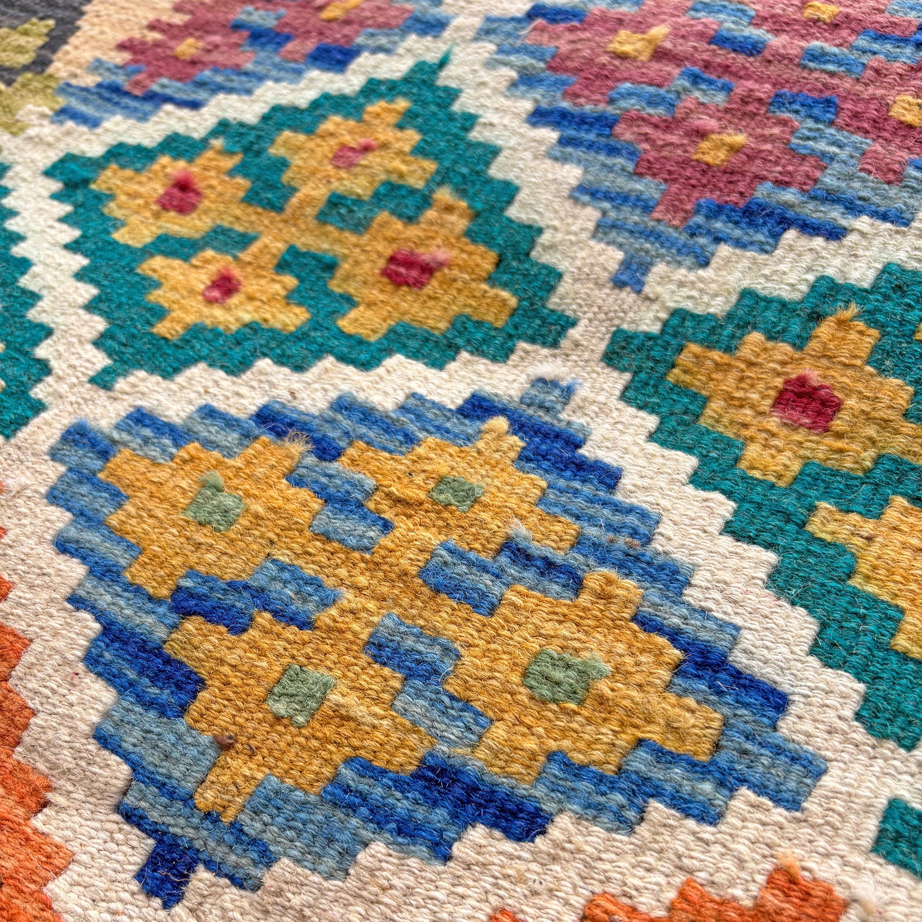 A small Herat Hazara Gelum of spectacular multicolour diamond composition — teal, magenta, yellow, orange — the nomadic textile tradition at its most unrestrained.