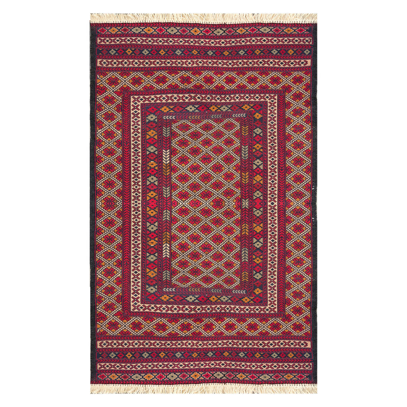 Not all kilim compositions resolve around a central medallion or a dominant motif. The trellis format — a continuous lattice of lines dividing the field into a repeating grid of lozenges, each containing a small geometric device — is a compositional type where the pattern is everywhere at once, systemic and all-enveloping, the eye moving across the surface rather than settling on a single point. On a deep crimson ground, the ivory trellis of this Herat Maliky kilim builds a surface of considerable visual complexity from a structure of almost mathematical simplicity: line and grid, repeated without interruption across the entire field. The Turkmen weavers of Herat have produced this format for generations alongside the more medallion-centred compositions of the tradition — it represents the more geometric, more abstract strand of the same vocabulary. Woven entirely in wool.