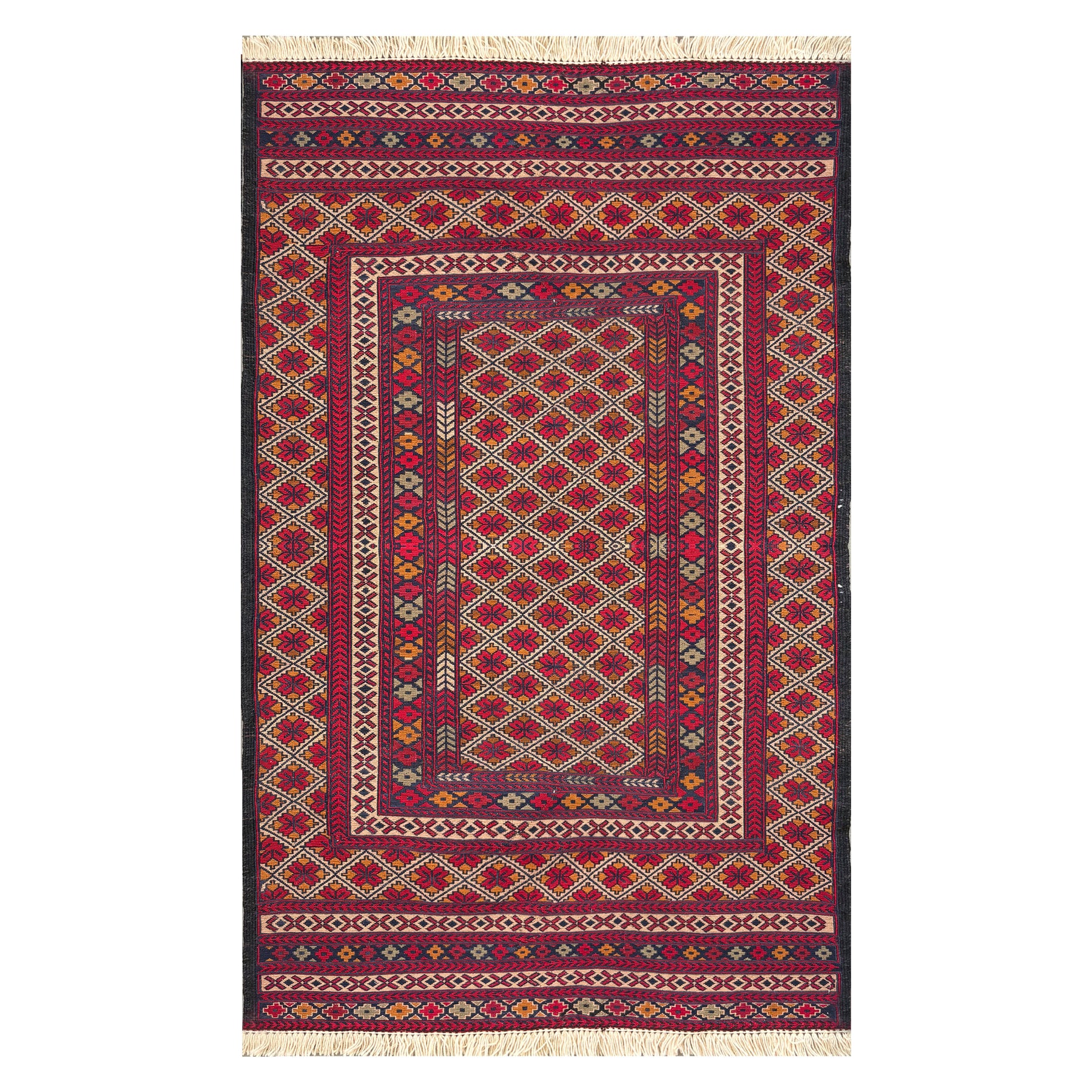 A Herat Maliky kilim of crimson field overlaid with a continuous ivory diamond trellis — a systemic pattern in which the beauty belongs to the whole rather than any single part.