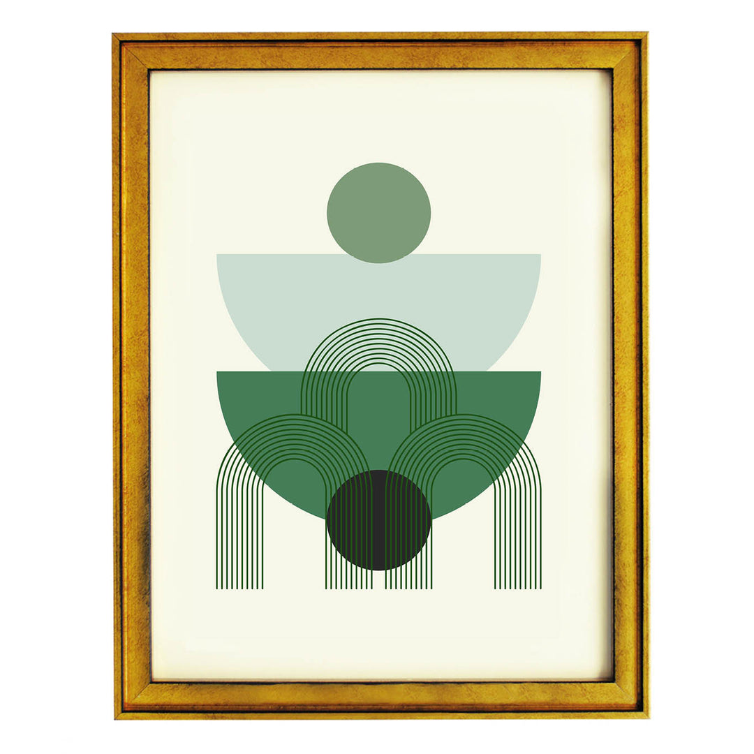 Shades of sage and emerald combine in an artwork that feels both grounded and experimental. Stacked forms and fine arches nod to natural structures and architectural order.