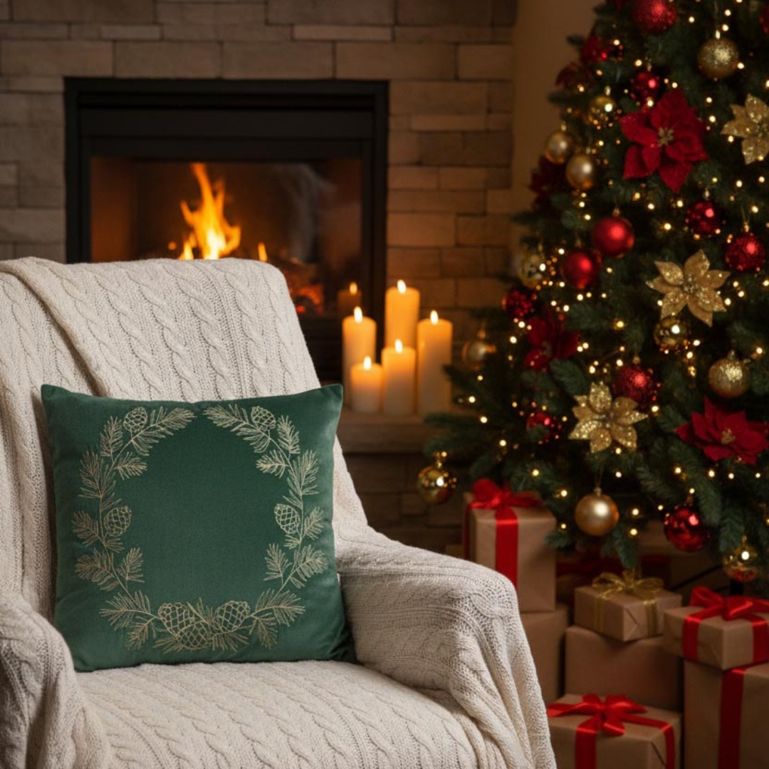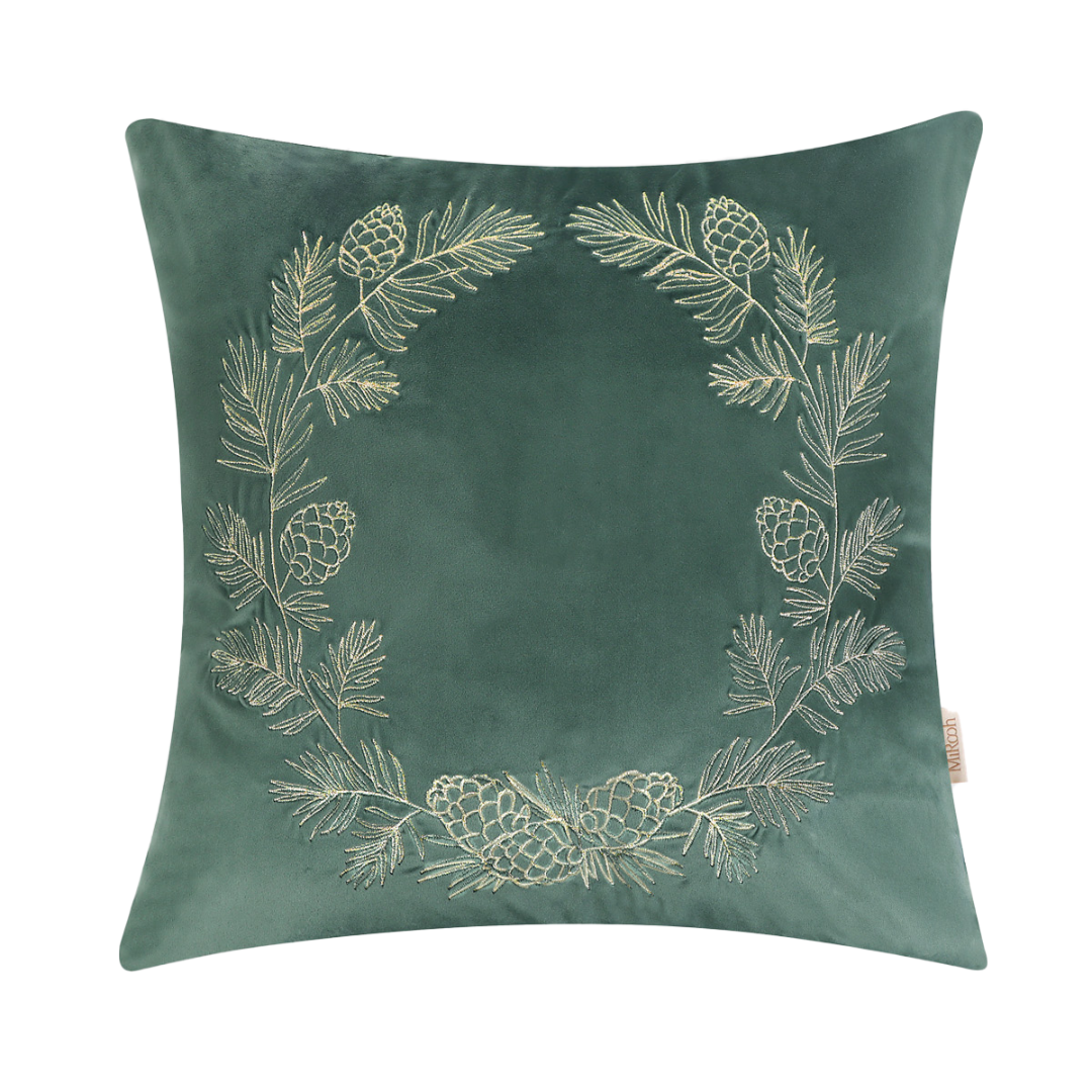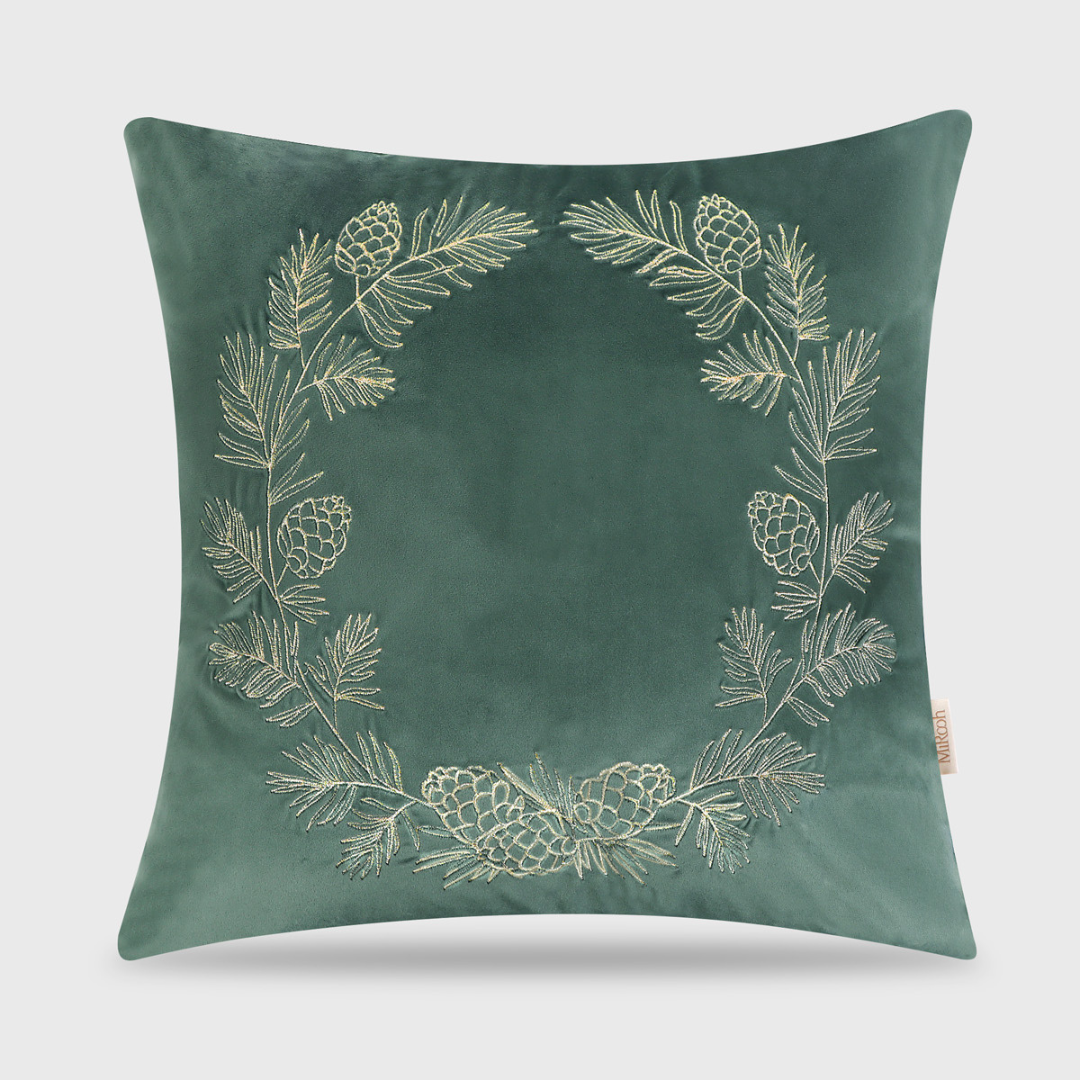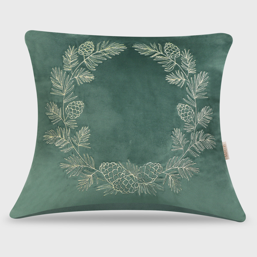 Golden Halo emerald cushion features a graceful wreath of pine needles and cones rendered in fine metallic zari, creating a warm, festive sheen. The smooth velvet base enhances the intricate details, adding depth and richness. Subtle yet striking, this piece brings a natural, winter-inspired charm to any room, offering a refined seasonal touch without overwhelming your space.
