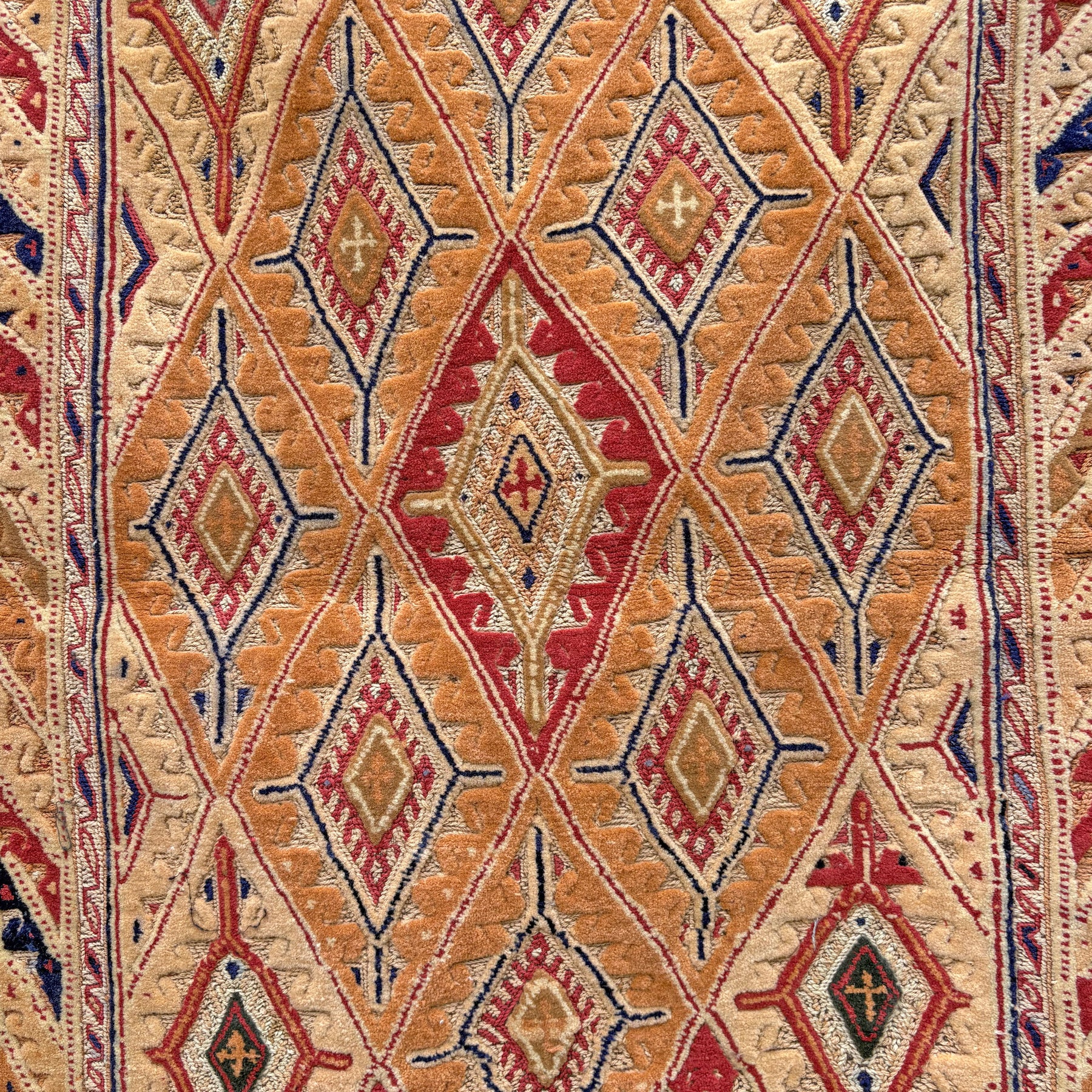 A Herat Mushwani kilim of warm amber ground with a geometric diamond lattice — the compound pile-on-flat-weave technique of the Mushwani tribe giving the surface its characteristic depth.