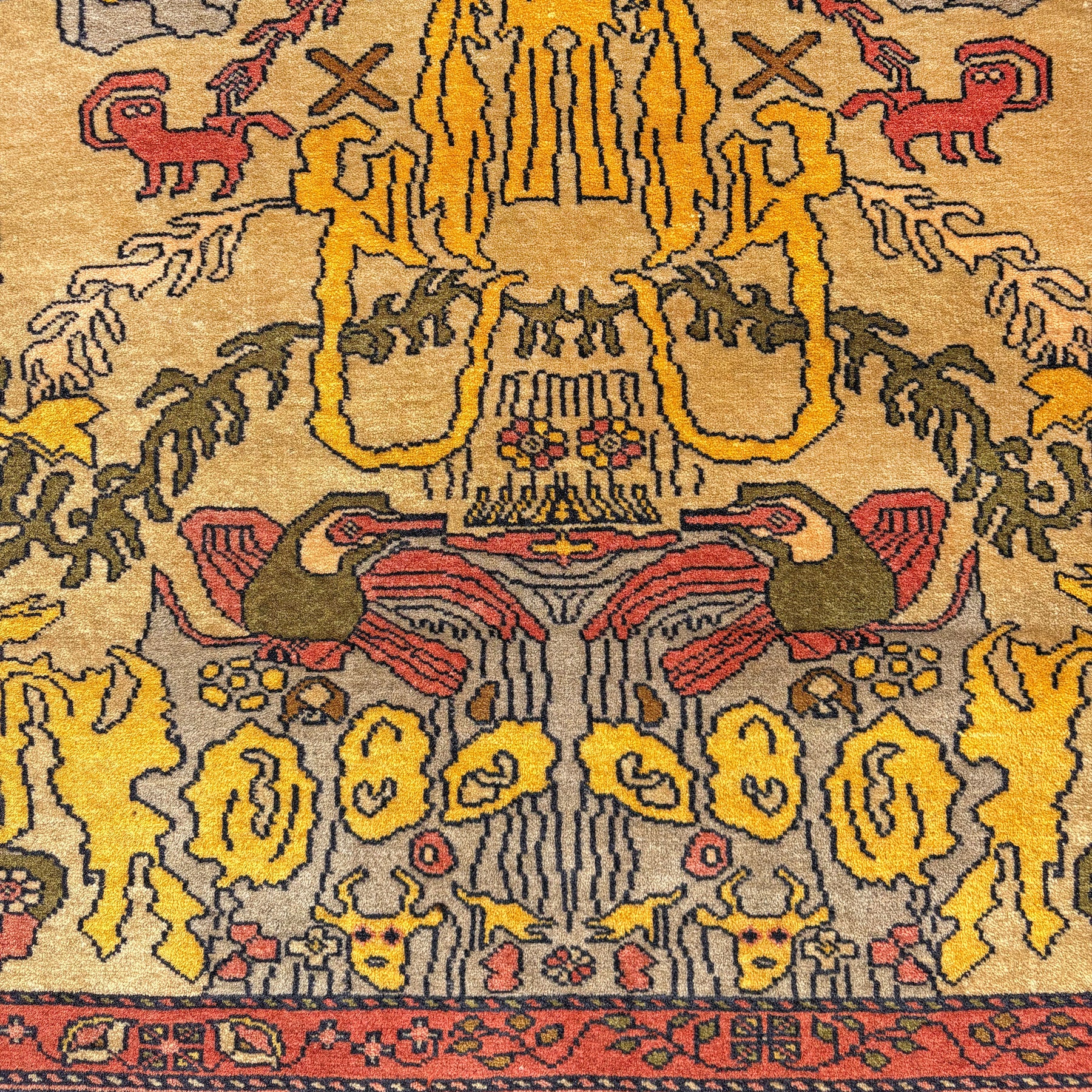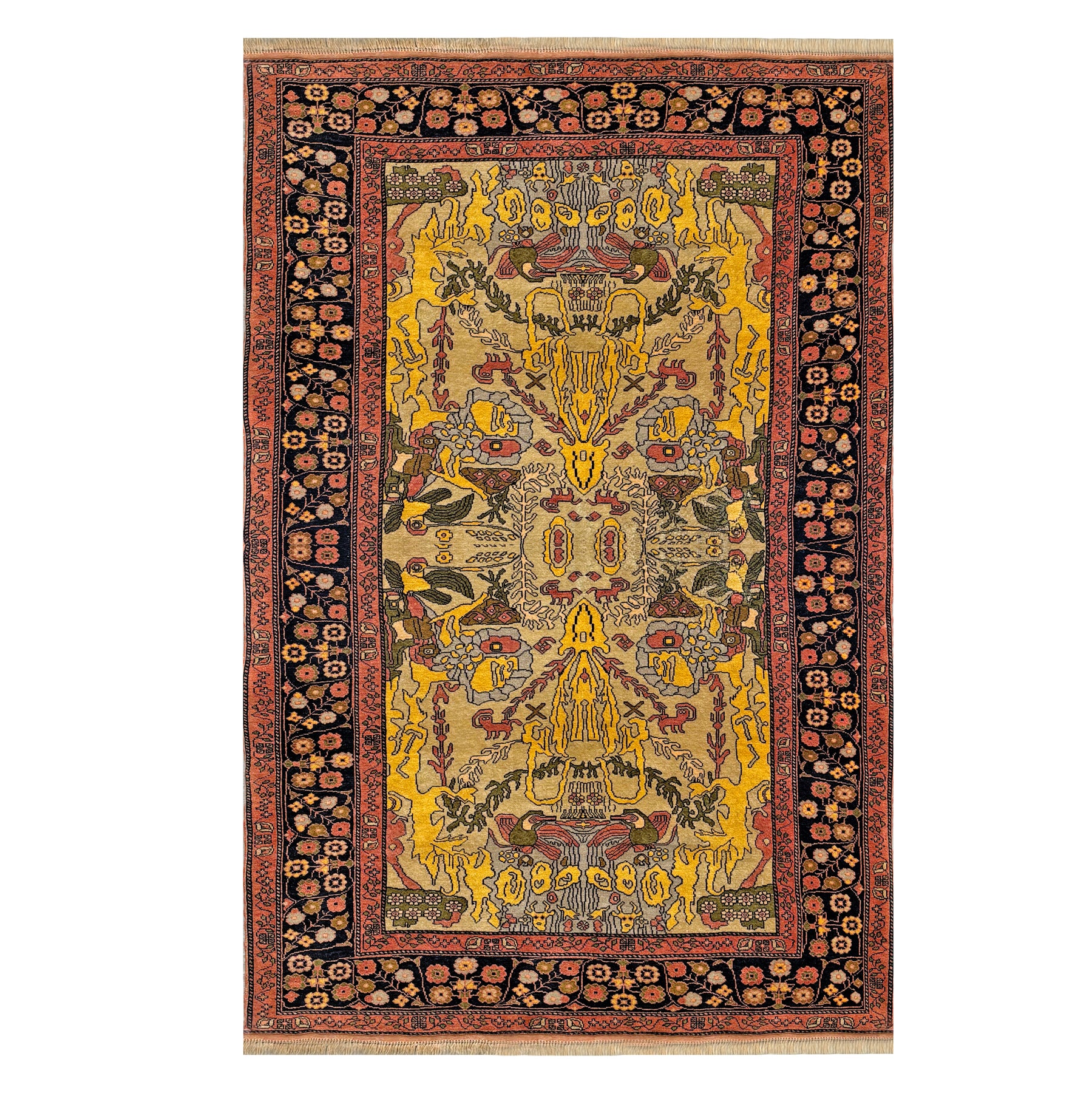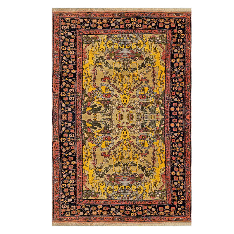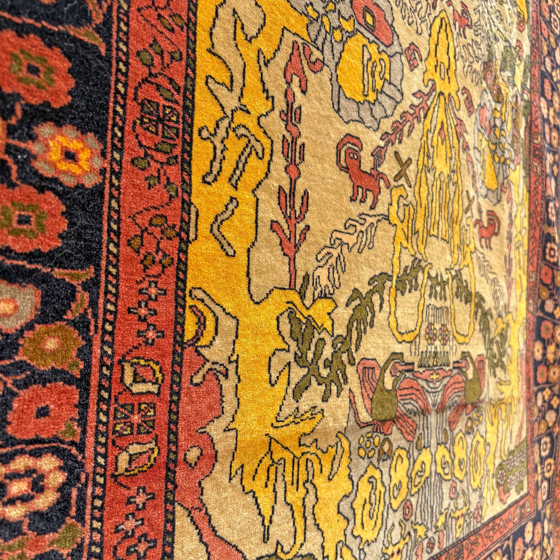 There are Afghan carpets that function as floor coverings. And then there are pieces like this. At 324 knots per square inch — nearly three times the standard of Afghan production, and a density that places this carpet in the company of the finest Persian workshop output — the Sarkhati demands months of continuous work from a single weaver. What that weaver chose to put into it here is a full figurative hunting scene: mounted horsemen in pursuit, leaping deer and gazelle, birds in flight, and stylised trees, all rendered across an amber-gold field in deep teal, crimson, ivory, and brown with the individual particularity that only this density allows. The paradise garden and the hunt are among the oldest narrative subjects in Islamic textile art. This piece, now approximately thirty years old, has developed the mellowed palette and softened luminosity that only natural dye and time produce together. It will not be encountered twice.