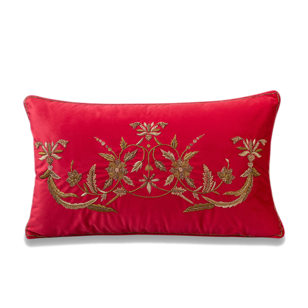 Hand embroidery that creates heirloom pieces was the focus of this Tarkashi collection. In soft yet powerful zardozi embroidery, luxury comes to life. A lush feathertouch velvet hosts intricate antique gold threadwork that spreads through the center of the cushion.