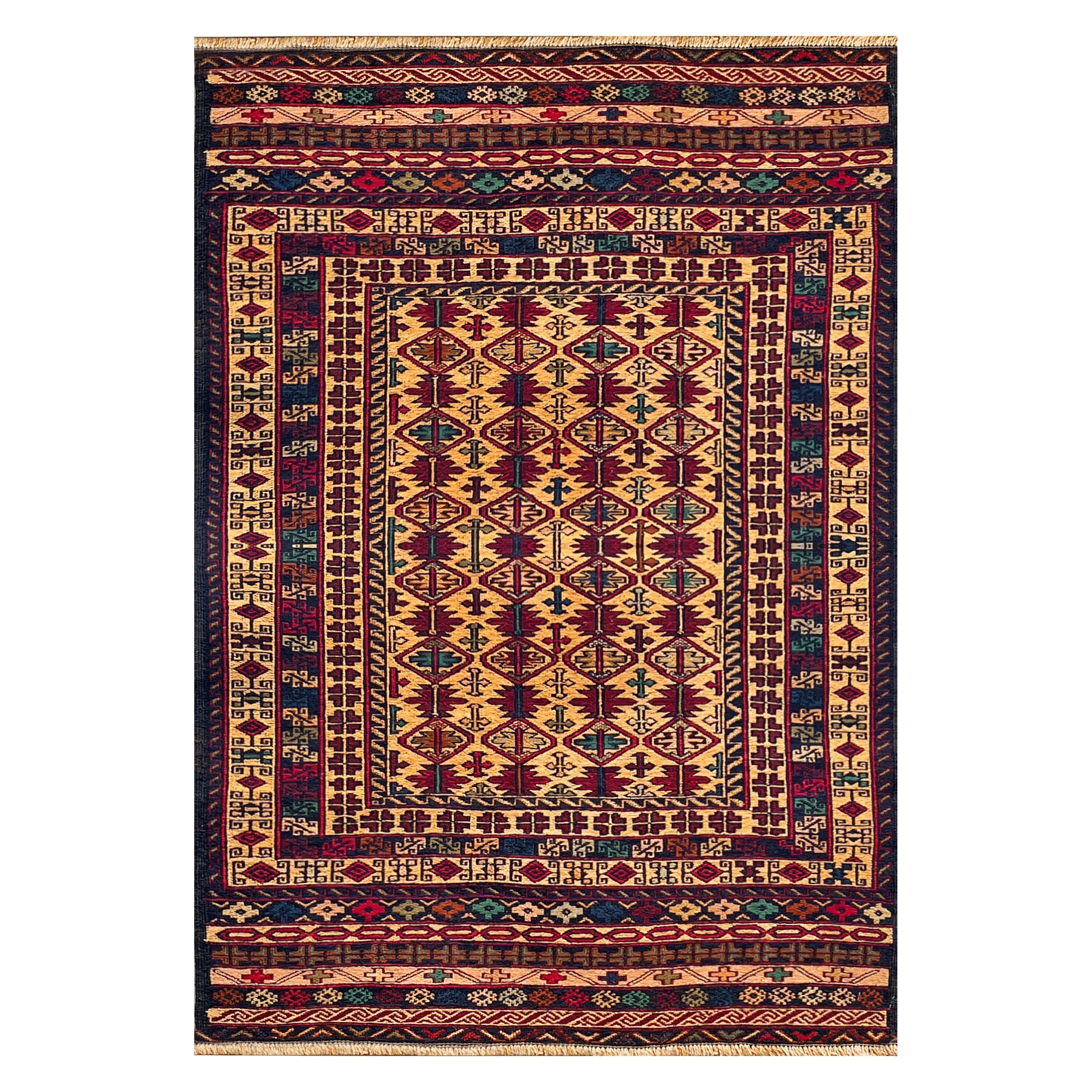 A Herat Maliky kilim of warm amber field with a precisely structured geometric diamond lattice — the Turkmen women of Herat working from memory, not pattern, to produce a composition of remarkable discipline.