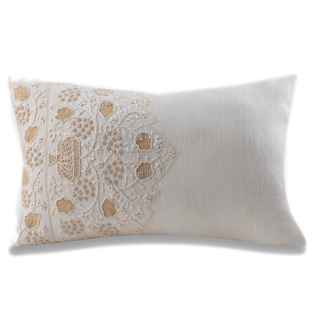 Taking a break from traditional embroidery that Phulkari is associated with, the Lais Van cushion is quite a modern take on a the handwork of Phulkari. It is beautifully set with trimmings such as silk pristine white thread as well as durable super quality pearls to lend to the modernist design that defines this look. A beige beautiful fabric supports this design that is intrinsically exquisite. Adorned with beautiful pearls this is how quiet luxury is defined in the modern world.