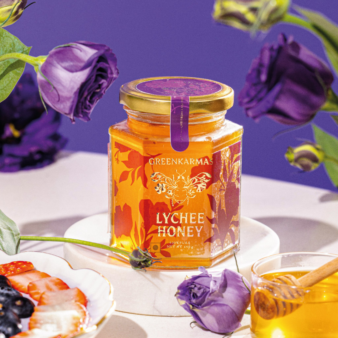 Delicate Floral Sweetness, Naturally Pure! - Sourced from the fragrant lychee orchards, GreenKarmas Lychee Honey is a light golden nectar with a delicate floral aroma and a fruity sweetness. Carefully harvested and minimally processed, it retains its natural purity—free from added sugar, artificial flavours, and preservatives.
