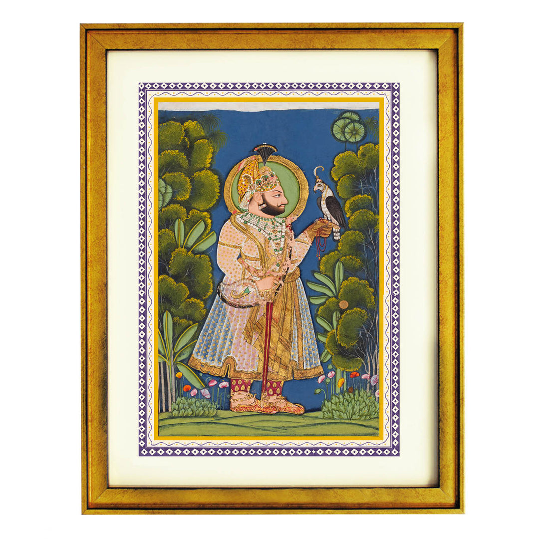 A Portrait of Power and Poise, A striking portrayal of regal command, this art print captures Maharana Jawan Singh of Mewar in an opulent courtly ensemble, poised against a vivid blue backdrop. Dressed in intricately detailed robes and adorned with ceremonial jewels, the Maharana holds a falcon—a timeless symbol of nobility, alertness, and sovereign control. Surrounded by lush foliage and framed with a traditional Rajasthani border, this painting echoes the refinement and grandeur of 19th-century Mewar portraiture.