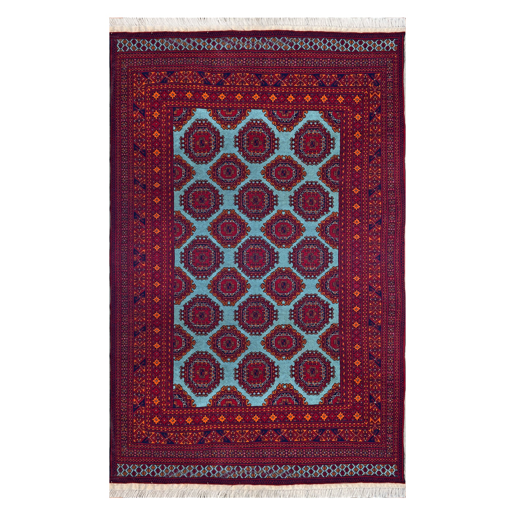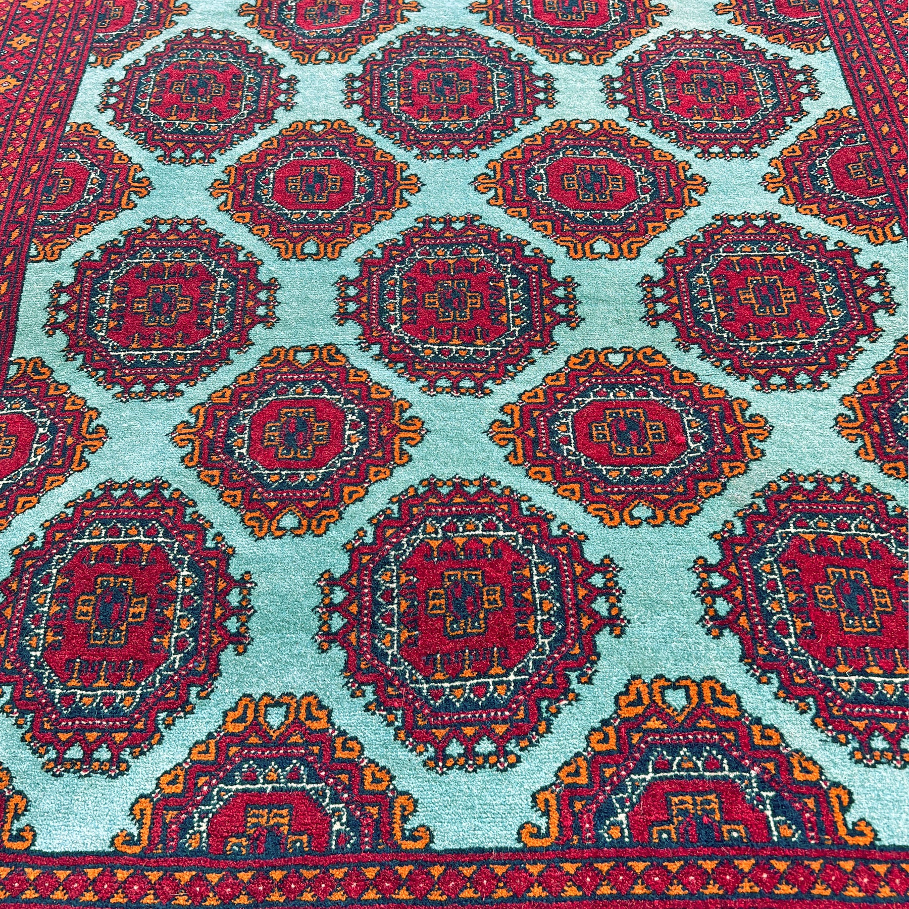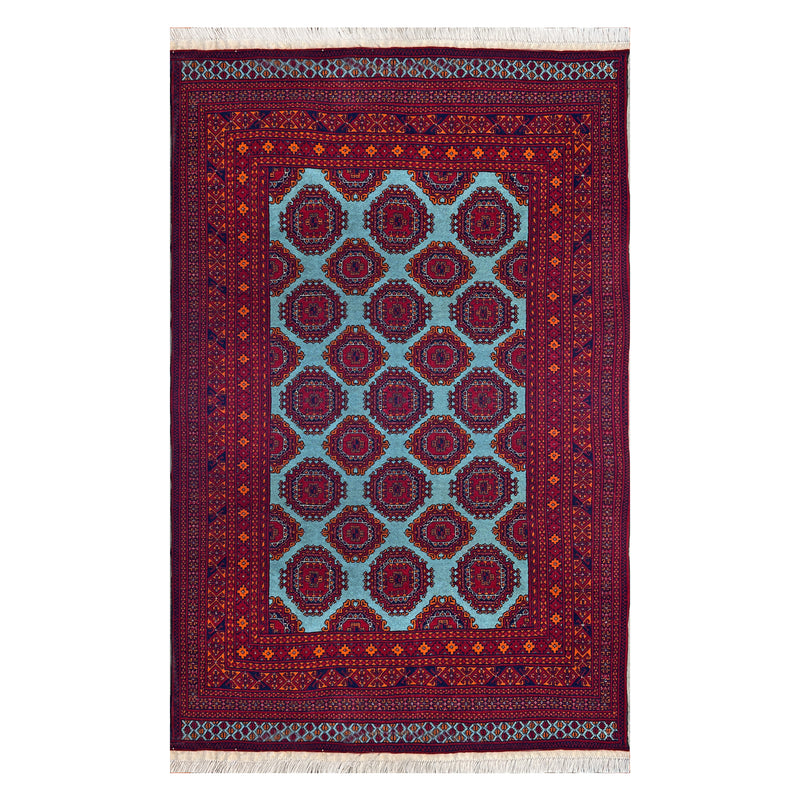 The teal ground of this carpet is not a happy accident. Achieved through the combination of indigo — the blue that has dyed textiles across Central Asia for millennia — with natural plant-source yellows in a process requiring precise timing and a weaver with an intimate knowledge of the dye, it is a colour that most Afghan workshop production never attempts. Against this clear turquoise field, the large octagonal gul medallions of the Ersari Turkmen tradition — rendered in deep navy and crimson — read with a freshness and visual authority quite different from anything the red-dominant Afghan palette produces. The Turkmen craftspeople of Mazar-e-Sharif have maintained the formal vocabulary of their Central Asian heritage while allowing this exceptional ground colour to announce something new. Knotted in wool on a cotton foundation at approximately 110 knots per square inch.