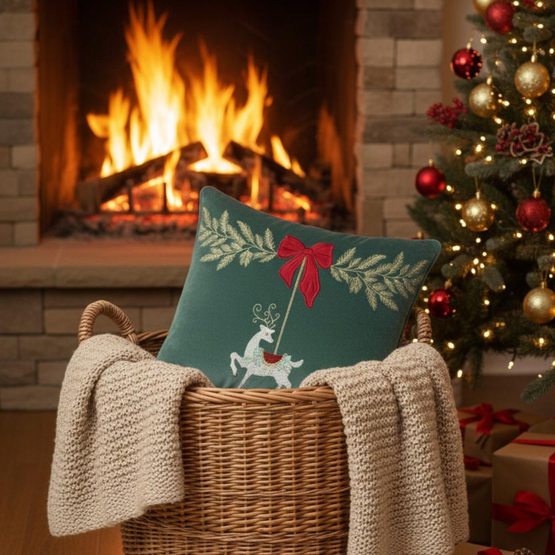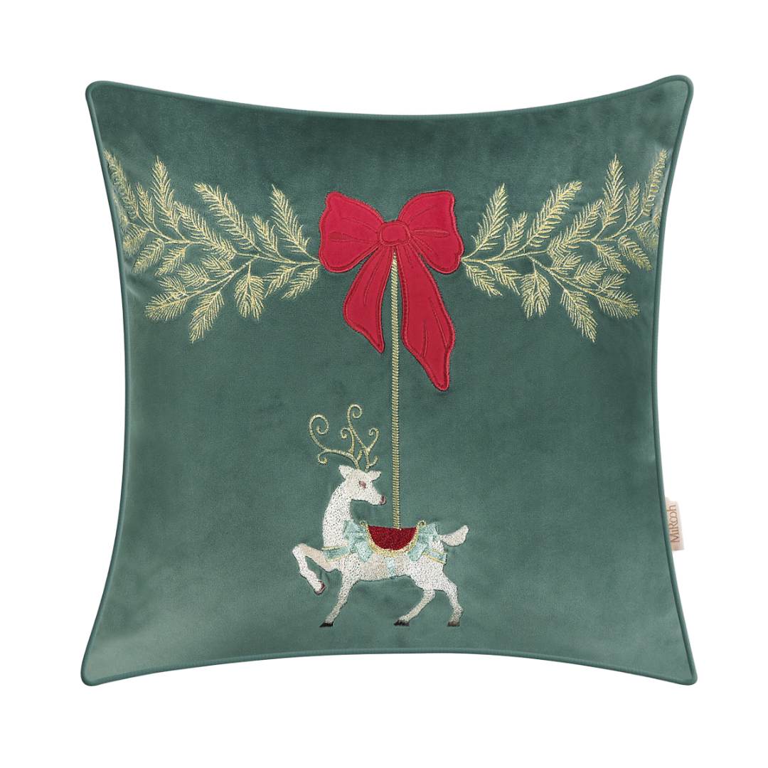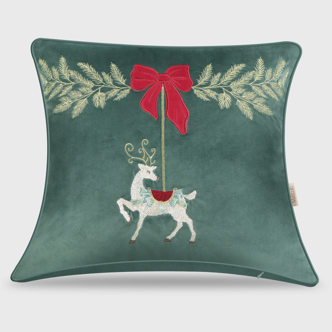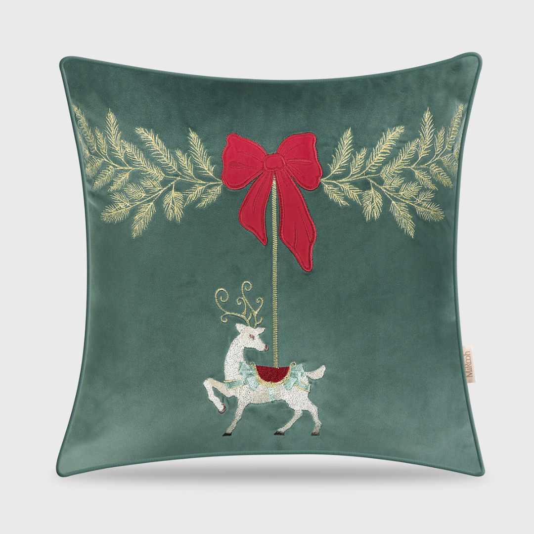 Merry Carousal emerald cushion brings festive charm with its exquisitely embroidered reindeer and appliquéd velvet bow, framed by shimmering zari foliage. Crafted on feather-touch velvet, it blends luxurious texture with playful holiday elegance. This cushion adds a joyful, refined accent to any space, making it a delightful seasonal standout for your home.