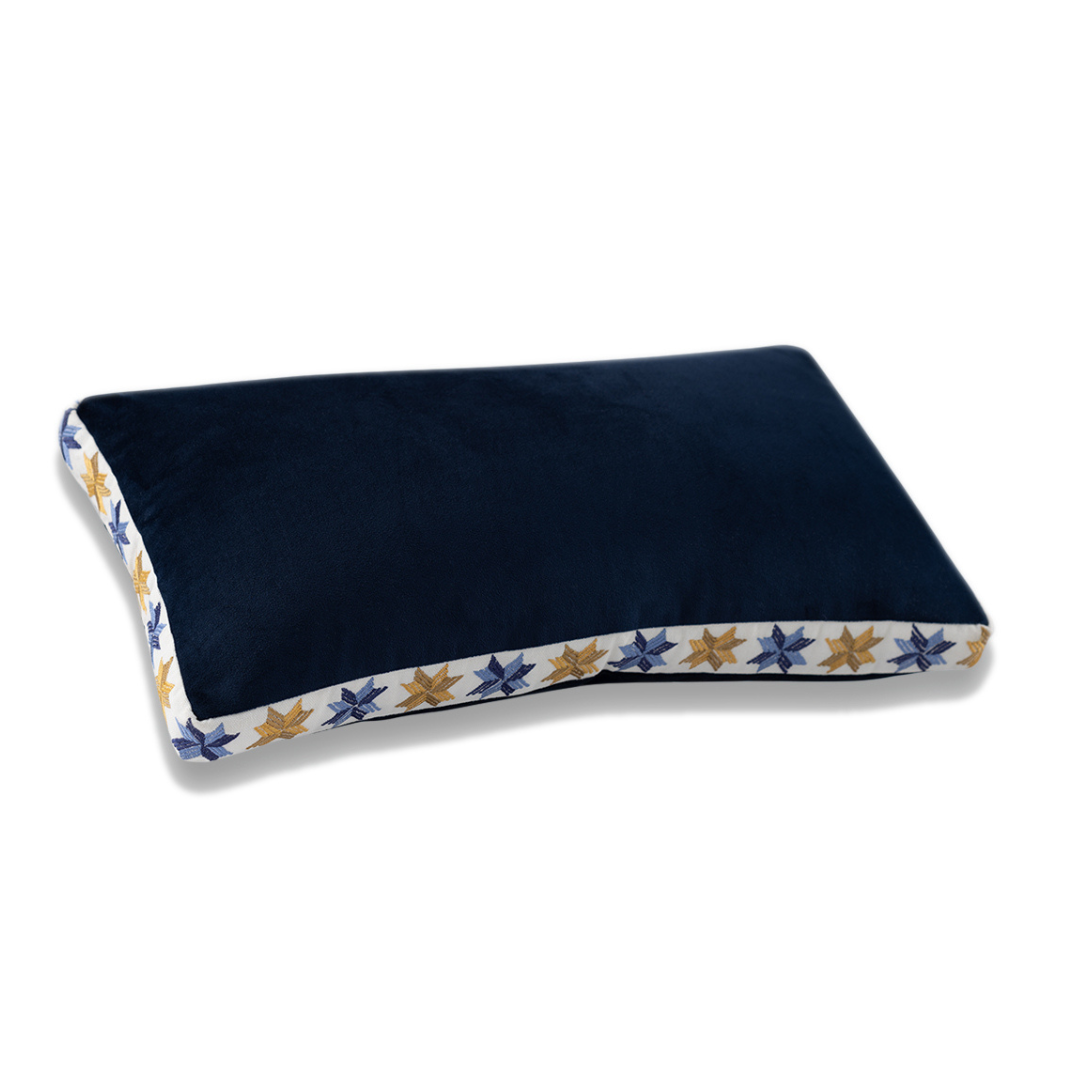 In a new design functionality, we juxtapose utility with craft. This beautiful piece is a blue indigo and what makes it special is the placement of the Phulkari work. Edges around the borders in a lovely star motif, the colours of yellow & indigo are often found worn by farm women of Punjab while doing something celebratory. Our cushion here adds to Mirooh rhetoric of subtle luxury. Where only the discerning eye will appreciate the subtle design nuance brought in by the handwork as well as placement.