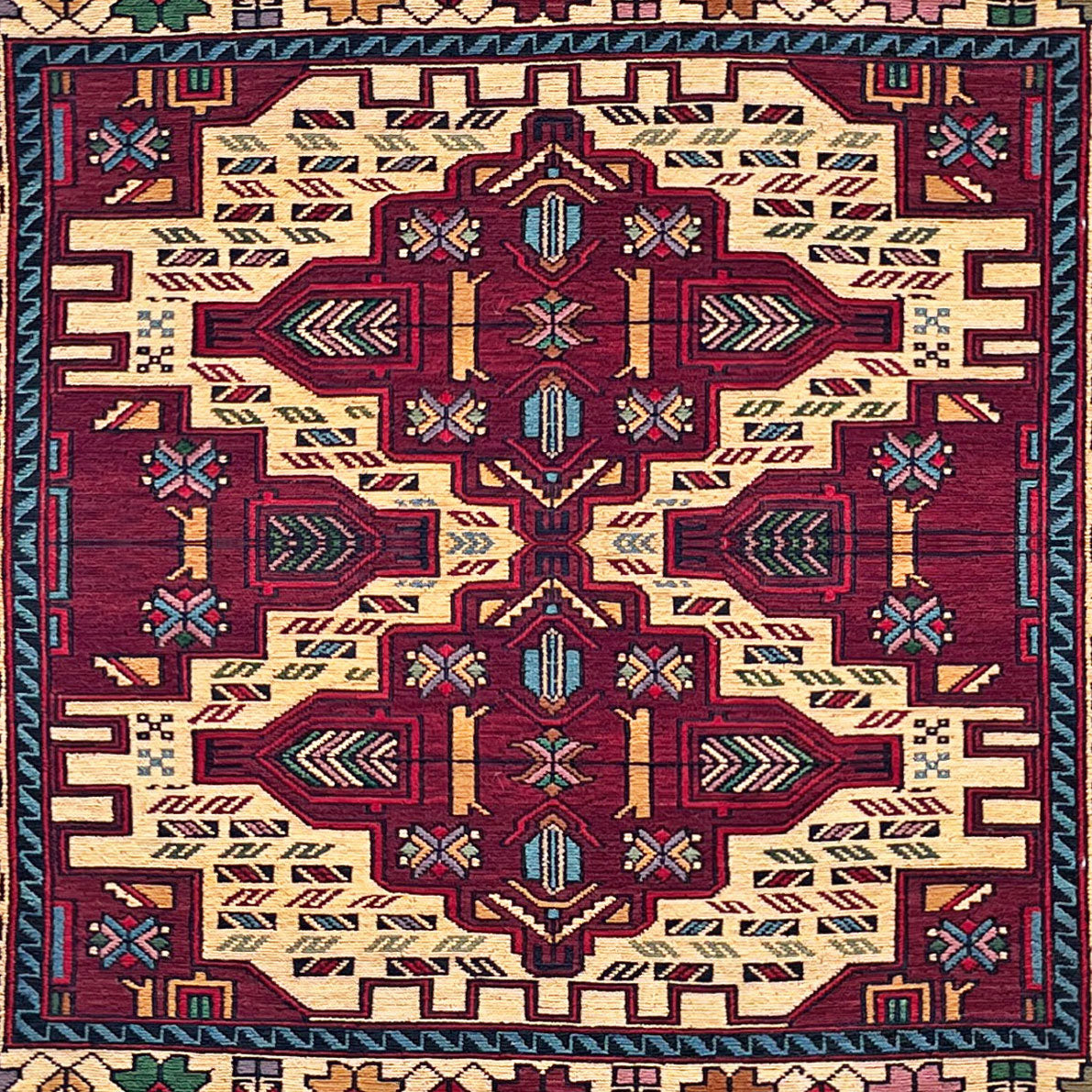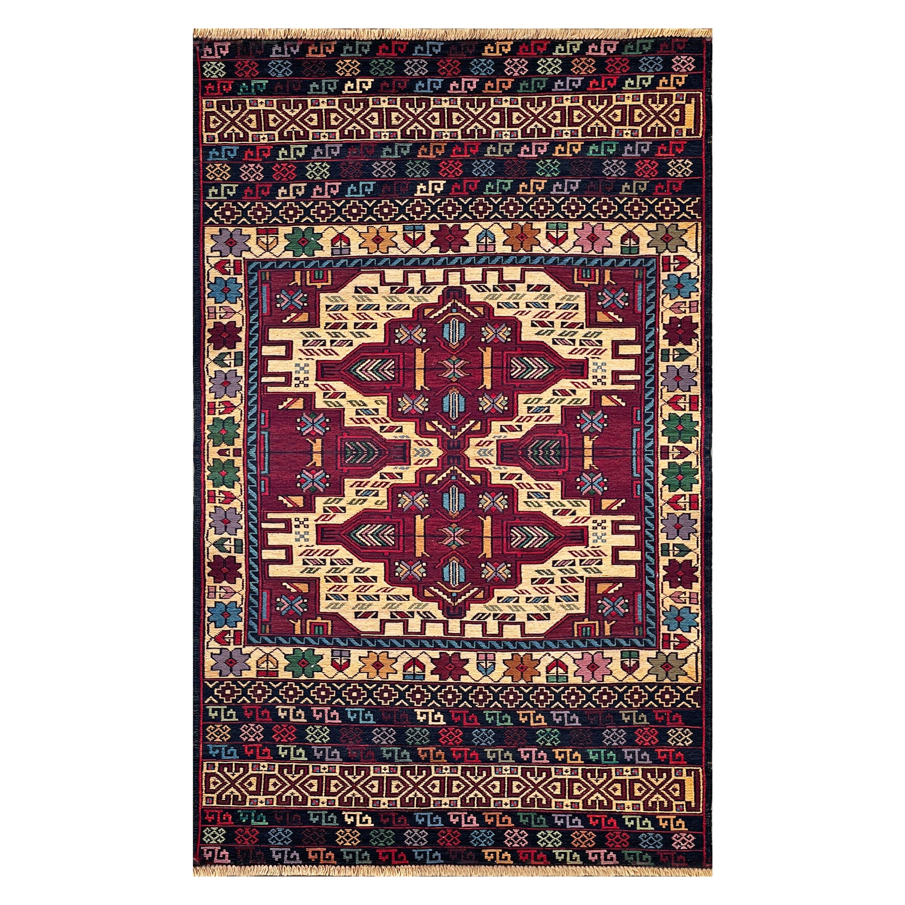 There is a compositional confidence to the Herat Turkmen kilim that comes from a tradition absolutely certain of its own vocabulary. The large central ivory medallion of this piece — set against a deep crimson field, its interior structured with star, cross, and angular diamond devices in navy and amber — does not negotiate with the eye; it simply dominates. The contrast between the saturated red ground and the luminous ivory medallion is the whole composition, and the Turkmen weavers of Herat have known since long before it became a principle of modern design that this pairing, made in hand-spun wool and natural dye, works with a directness that few other arrangements achieve. The multicoloured horizontal border bands at head and foot, worked in vivid narrow geometric stripes, are characteristic of Herat flat-weave production. Woven entirely in wool.
