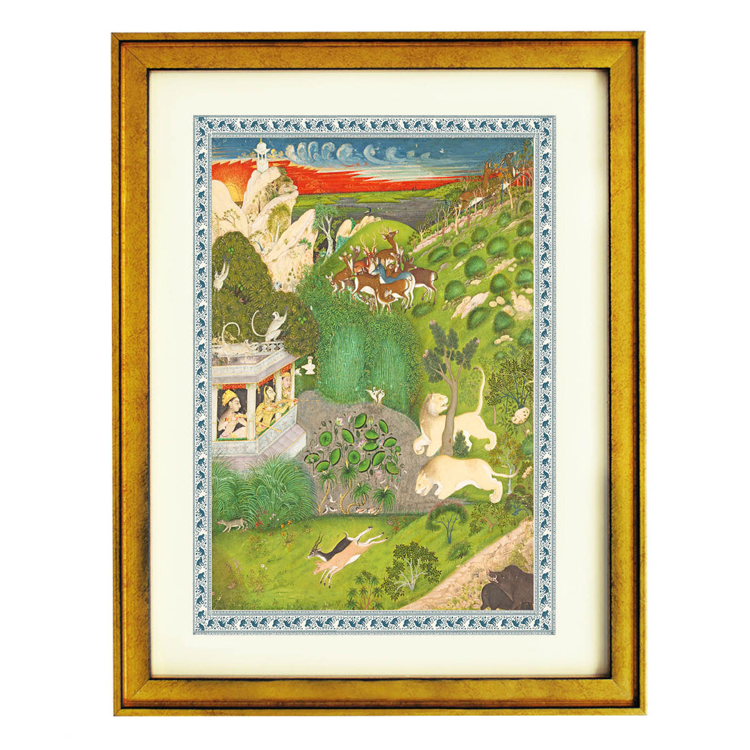 A striking miniature-style print capturing royal women poised in a marble pavilion, aiming into a lush forest alive with deer, lions, and leopards. Richly detailed and bordered with intricate motifs.