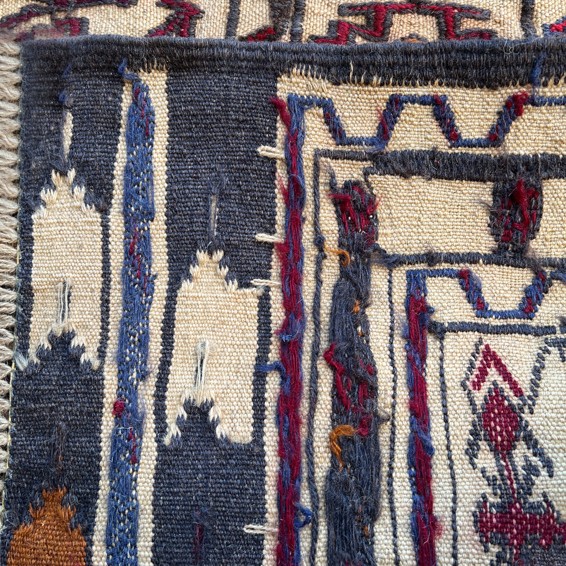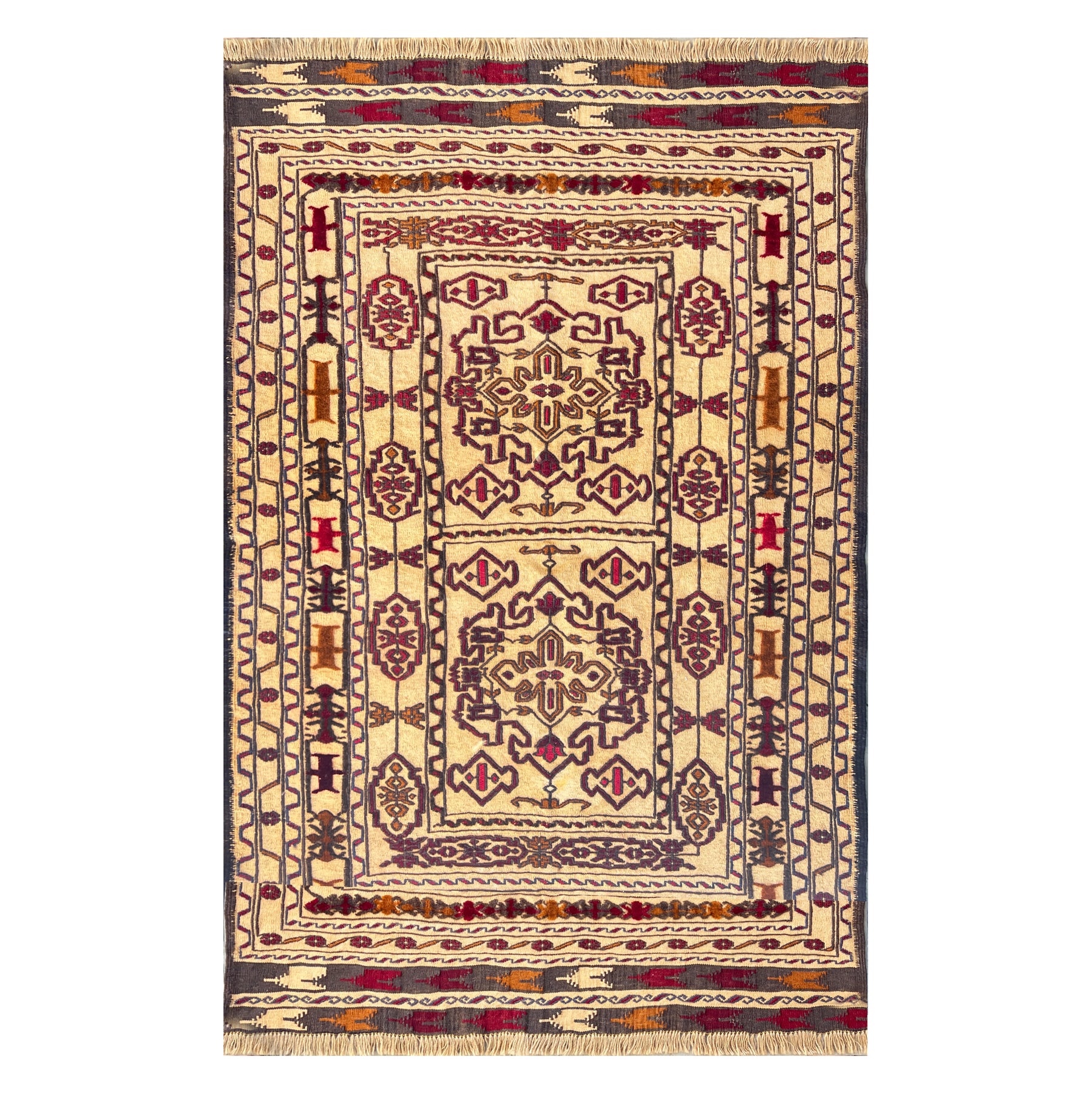 The suzani — the large embroidered textile produced by women across Uzbekistan, Tajikistan, and the broader Central Asian tradition as a central element of the dowry — is known for the density and richness of its surface: silk on cotton, motif upon motif, the field covered in botanical and geometric devices worked over months or years. The Sozani kilim of Herat takes the name and the vocabulary but translates them into the flat-weave format with an unusual restraint: the cream-ivory ground carries a spare, elegant repeat of stylised geometric-floral medallions in crimson and navy, the field visible between the devices, the composition open and breathing in a manner that the Afghan kilim tradition rarely permits itself. The characteristic vertical stem and branching motifs that connect the scattered devices are the clearest link to the suzani heritage. Woven entirely in wool by Turkmen craftspeople in Herat.