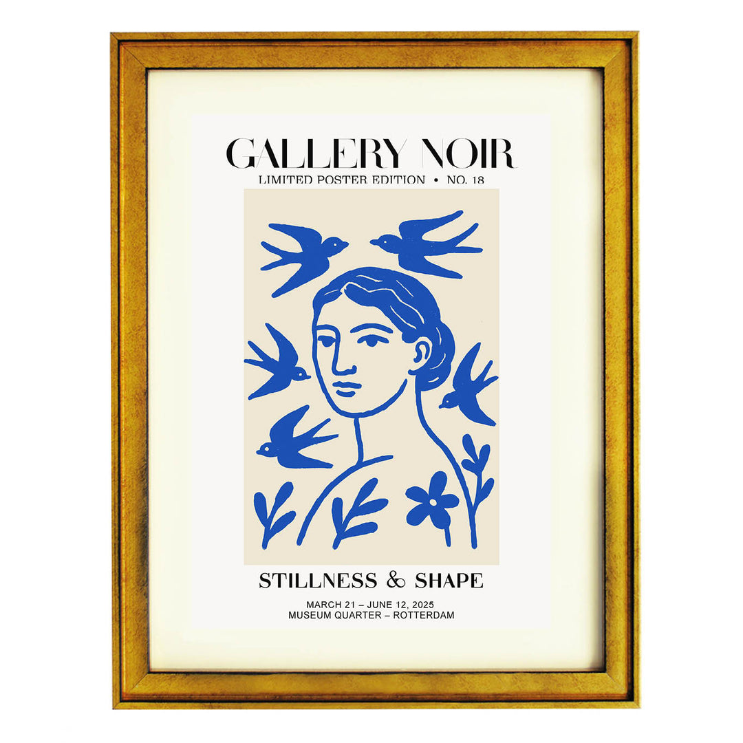 A Grecian-style muse surrounded by playful birds and foliage—all painted in ultramarine. Romantic and whimsical, this piece channels the spirit of Matisse and daydreams.