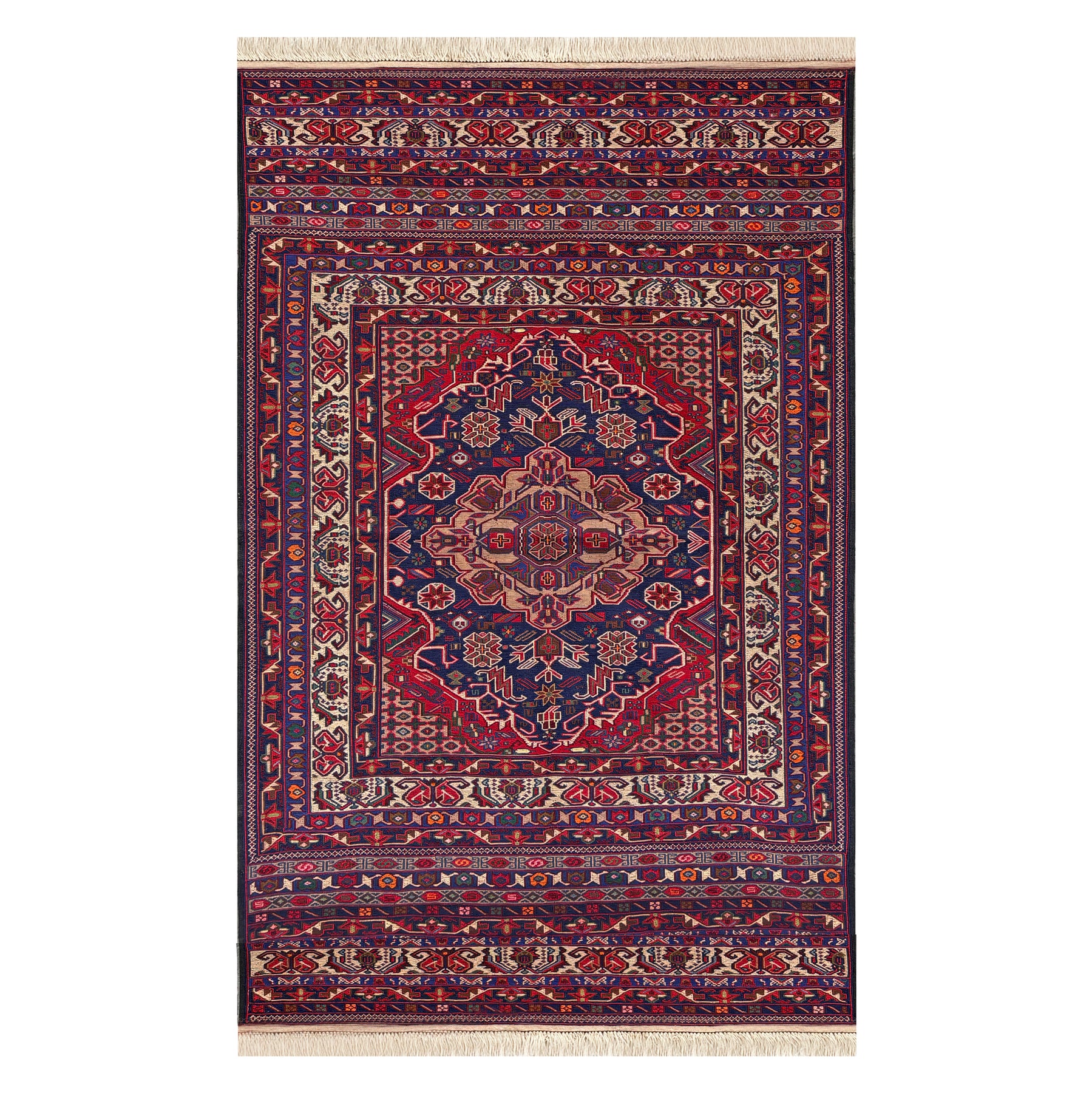 Red and blue. The pairing is as old as the Afghan carpet tradition itself — madder and indigo, the two natural dyes most deeply rooted in the textile history of Central Asia — and in the hands of the Turkmen weavers of Herat, it has been resolved in hundreds of different compositions across centuries of production. This large kilim brings the pairing to the flat-weave format: the deep crimson field centred by a large navy-indigo hexagonal medallion, the interior of which carries an elaborate botanical and geometric composition in coral, ivory, and amber that bridges the strictly geometric Afghan tradition and the more curvilinear influence of Persian classical design. The ivory inner border and the multiple geometric outer border strands give the composition structural clarity at every viewing distance. Woven entirely in wool.