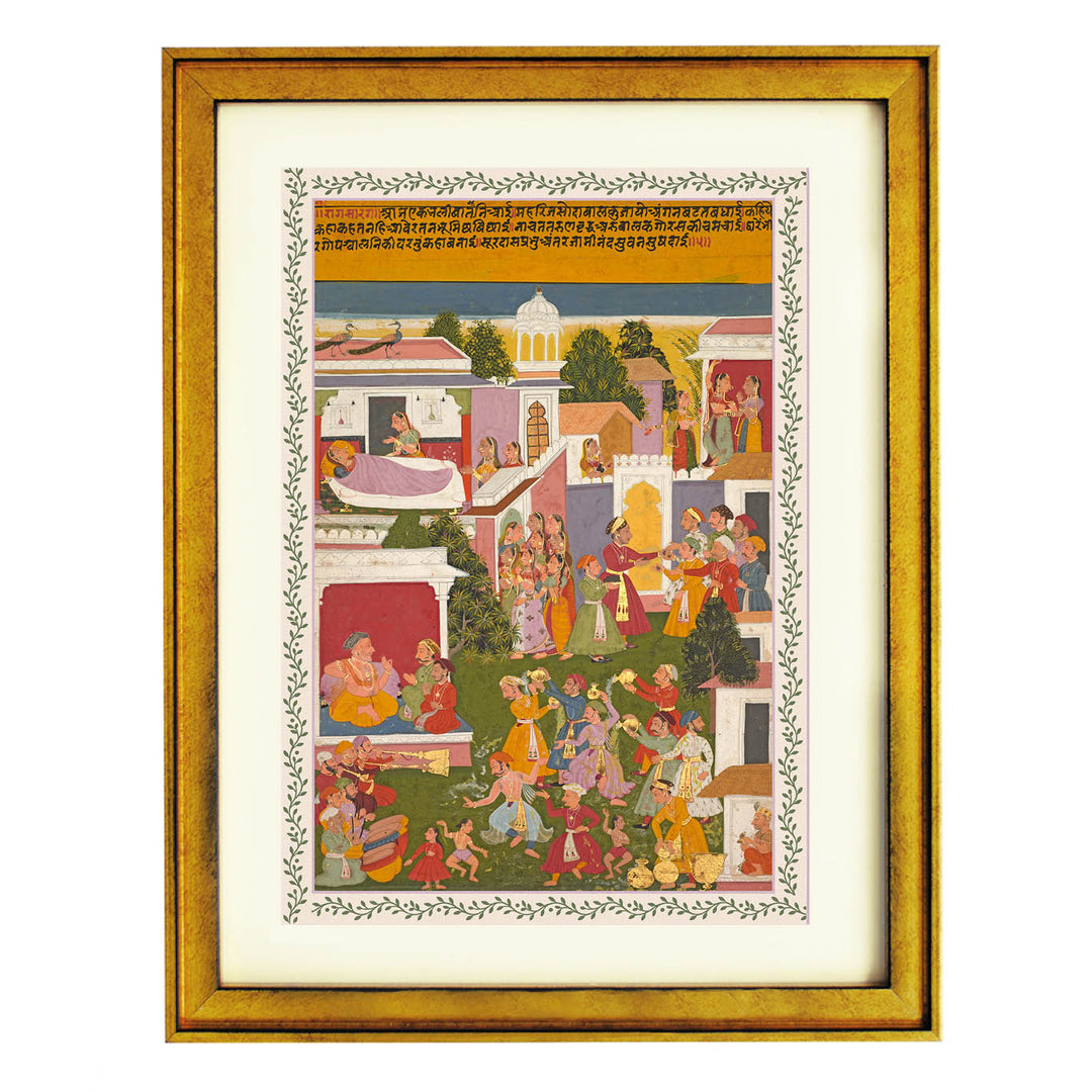A vibrant celebration of divine birth, this fine art print illustrates The Birth of Krishna as depicted in a folio from the Sursagar of Surdas. Brimming with joyous movement, music, and richly dressed figures, the scene unfolds in layered architectural spaces—capturing the enchantment of a divine arrival.