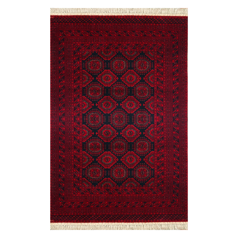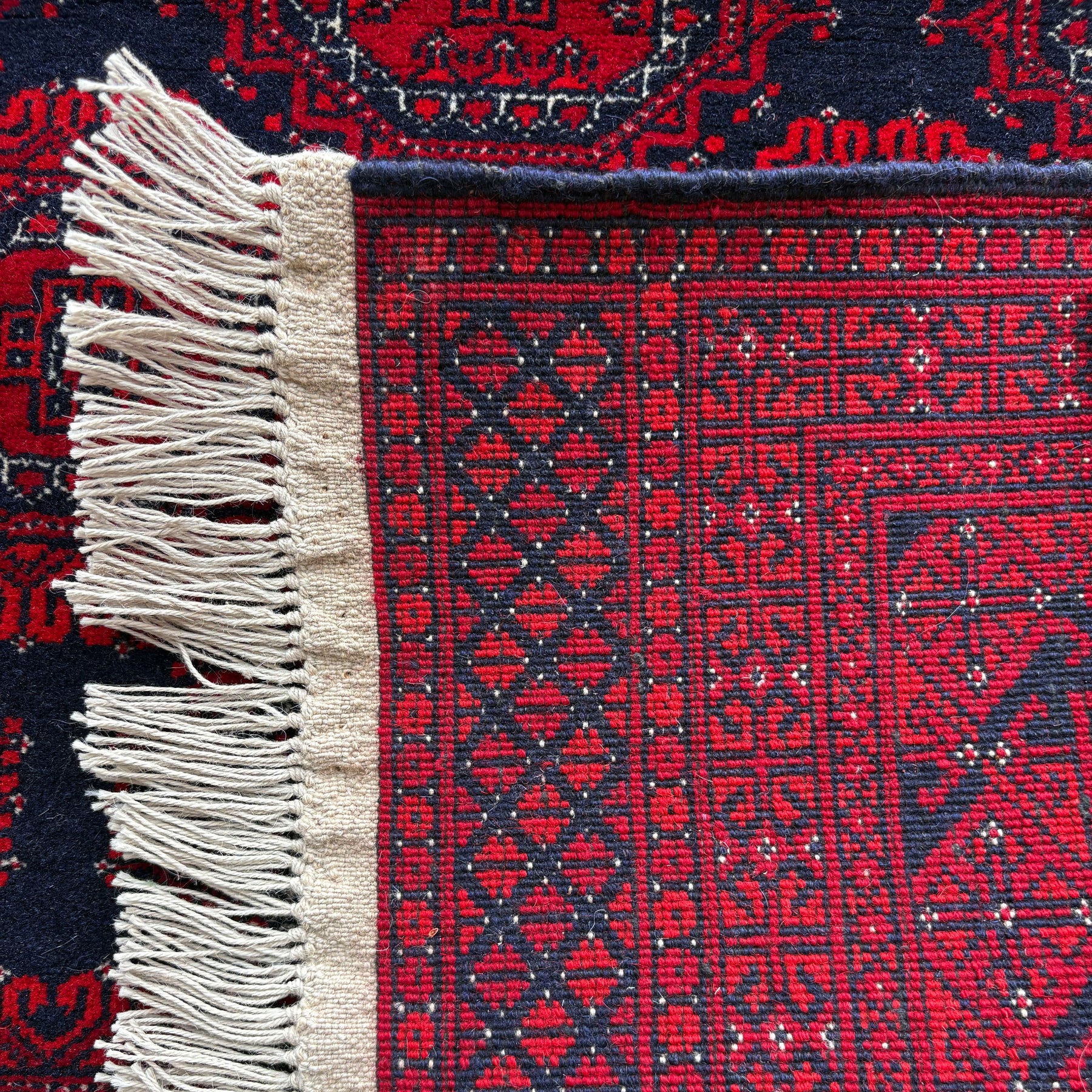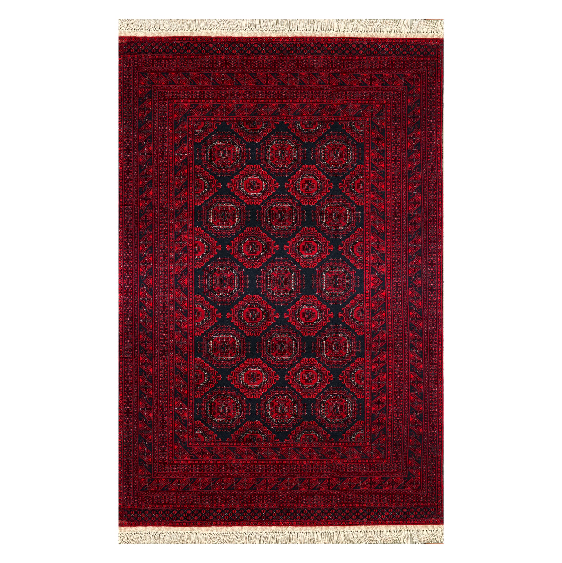The gul has been the central motif of Turkmen weaving for almost a thousand years. It is the tribal medallion — the octagonal form that identifies a clan, marks a lineage, asserts a presence — and it has travelled with the Turkmen from Central Asia into Afghanistan without losing its essential character. In this carpet, the gul-repeat is rendered in a near-monochromatic palette: deep crimson medallions on a slightly darker crimson ground, the distinction in tone rather than colour, the cream fringe at head and foot the only relief. It is a composition of considerable restraint and formal confidence — a carpet that does not need contrast to hold a room. Knotted in wool on a cotton foundation by Turkmen craftspeople in Mazar-e-Sharif at approximately 110 knots per square inch.