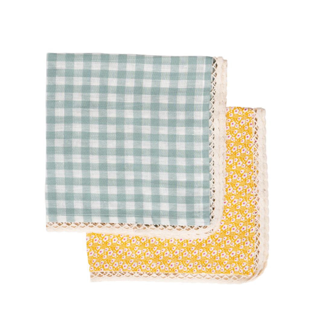 Set of two napkins, one in a gingham linen fabric and othe other in a yellow cotton print. The edges are trimmed with a whote cotton scallop design lace.